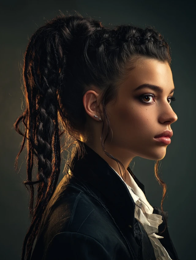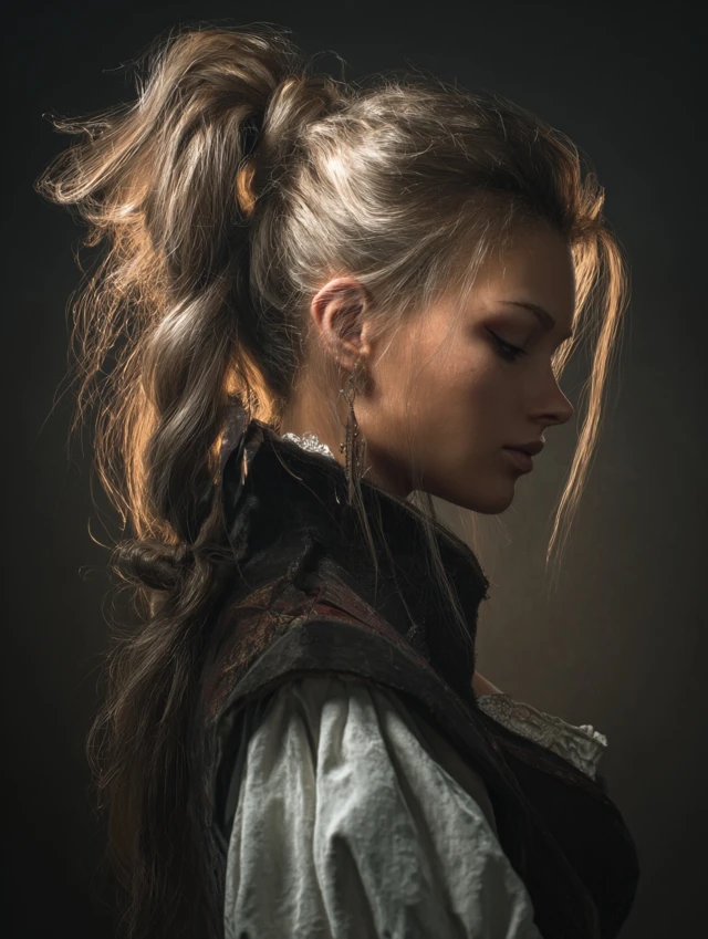 A high ponytail combined with twisted front sections creates a bold, energetic pirate style. Suits oval and square faces. Works with medium to long hair; fine hair may need teasing for volume.