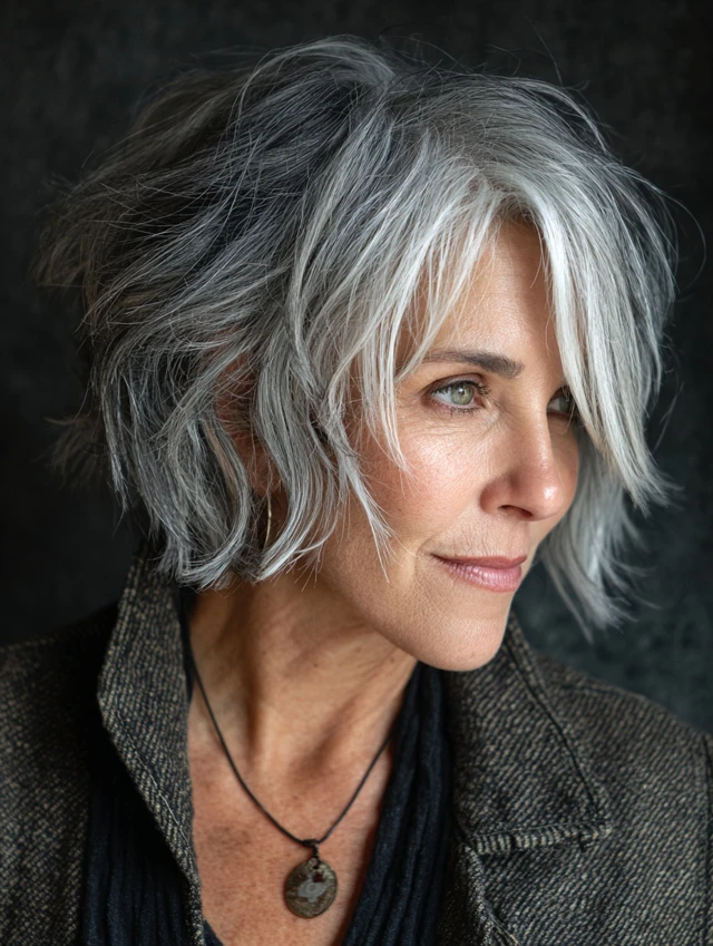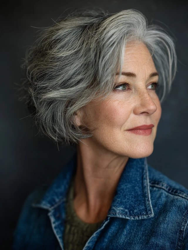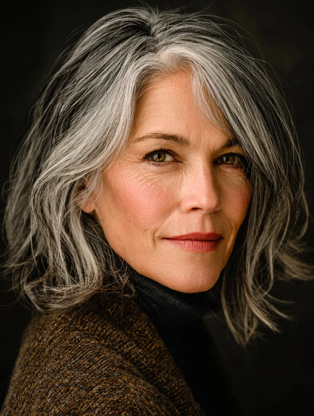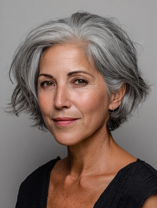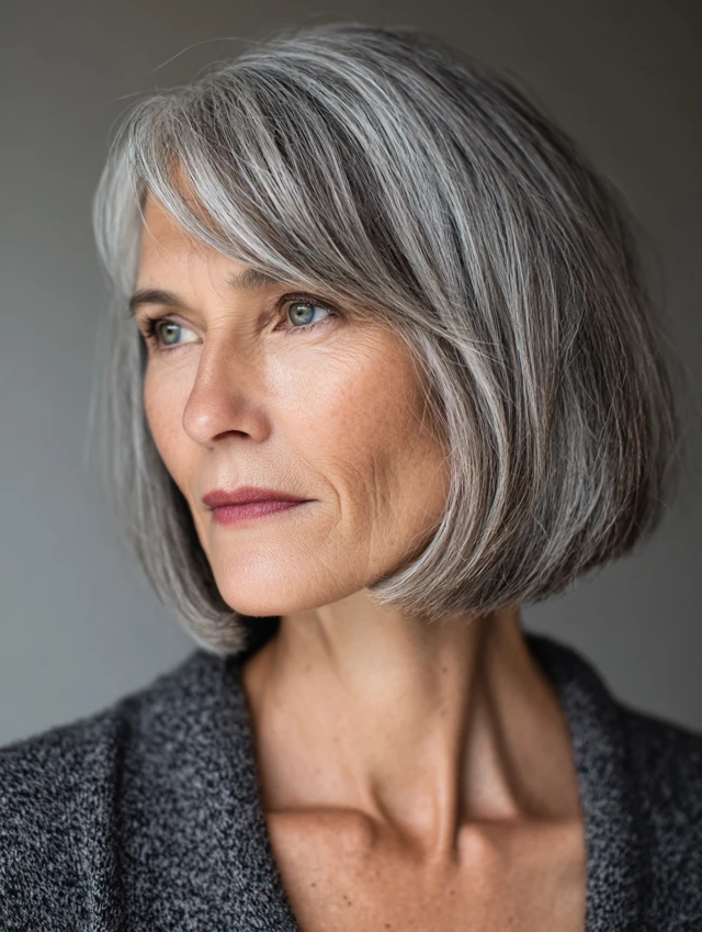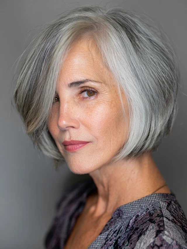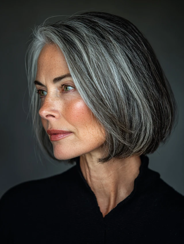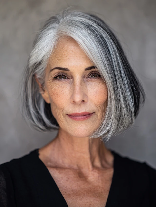 A bob cut highlights the contrast between gray and darker strands, creating clean lines and dimension. It suits oval, heart-shaped, and square faces. Straight or slightly wavy textures show off the color blend beautifully.