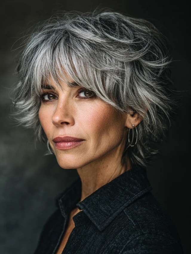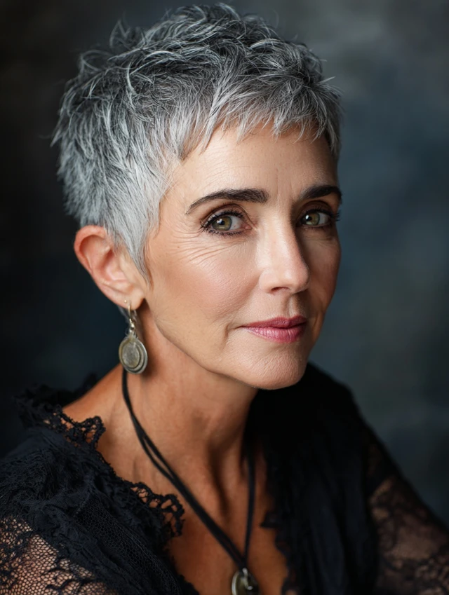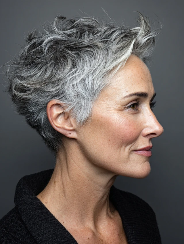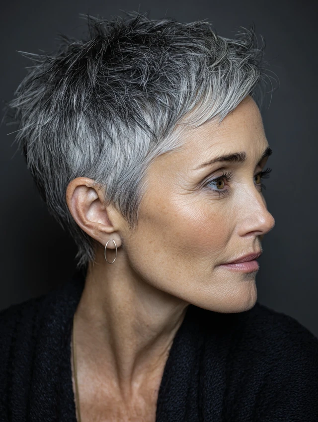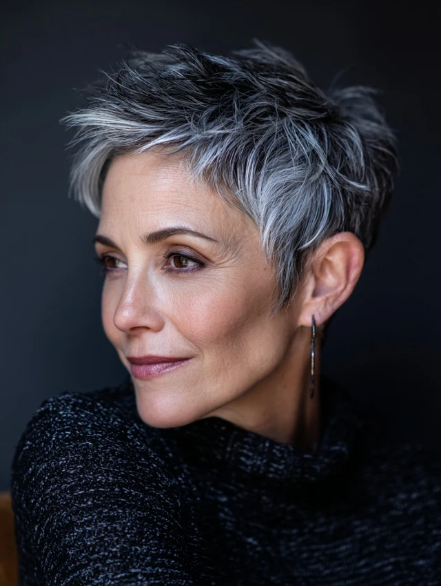 A textured pixie adds edge and volume while showcasing salt and pepper tones. Best for oval and heart-shaped faces, this cut works well for fine or thinning hair.