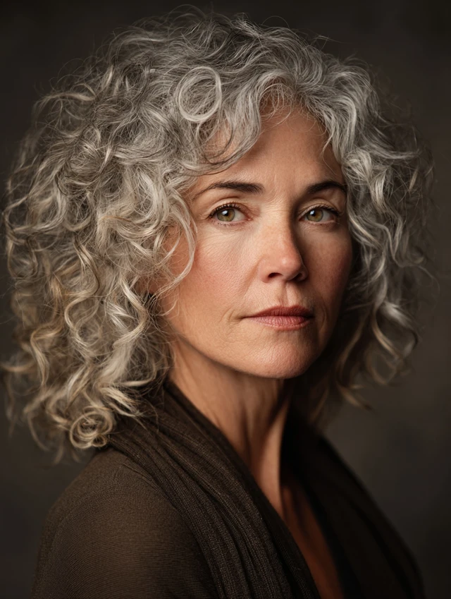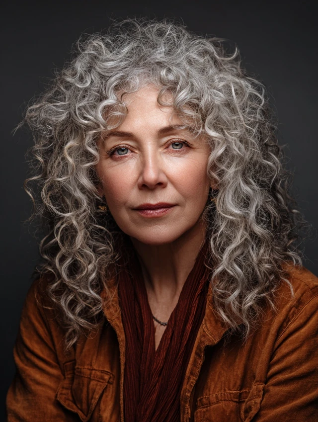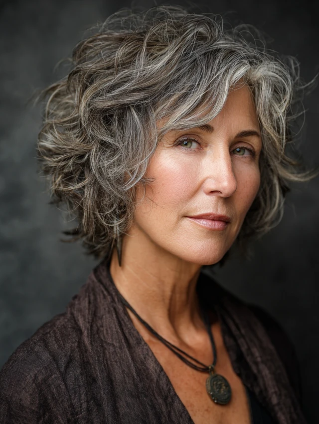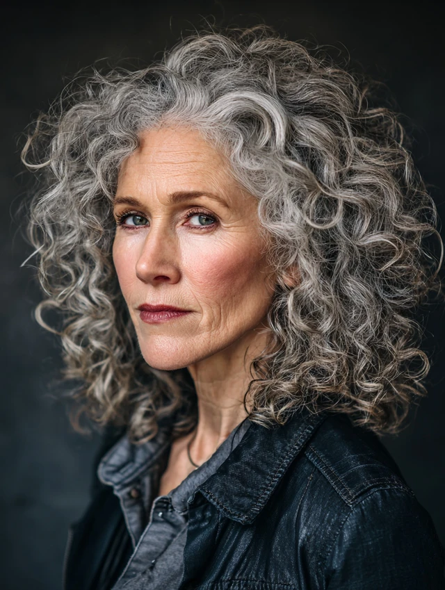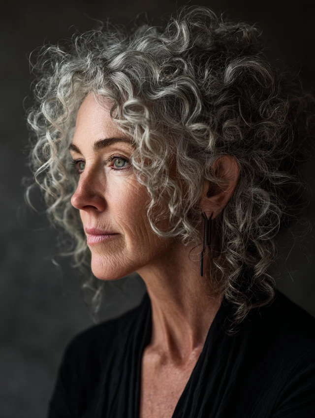 Natural curls paired with salt and pepper tones create volume and texture. This style works well for oval and round faces. Curly hair enhances the color contrast naturally.
