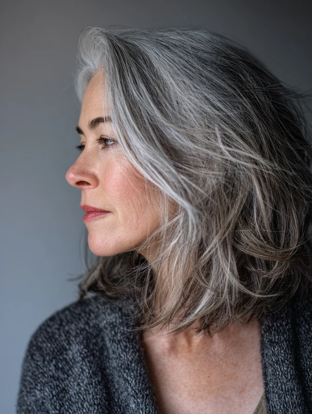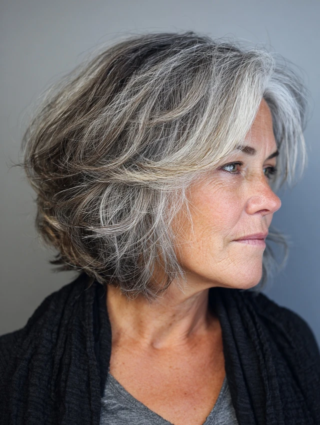 This style features soft layers that add movement and volume to naturally graying hair. It works well for oval, round, and square face shapes. Fine to medium hair benefits from the layered structure, which prevents hair from looking flat or thin.