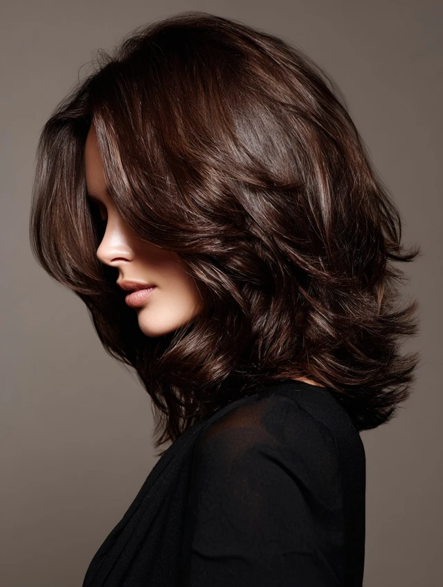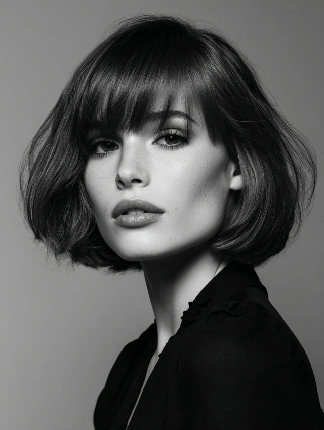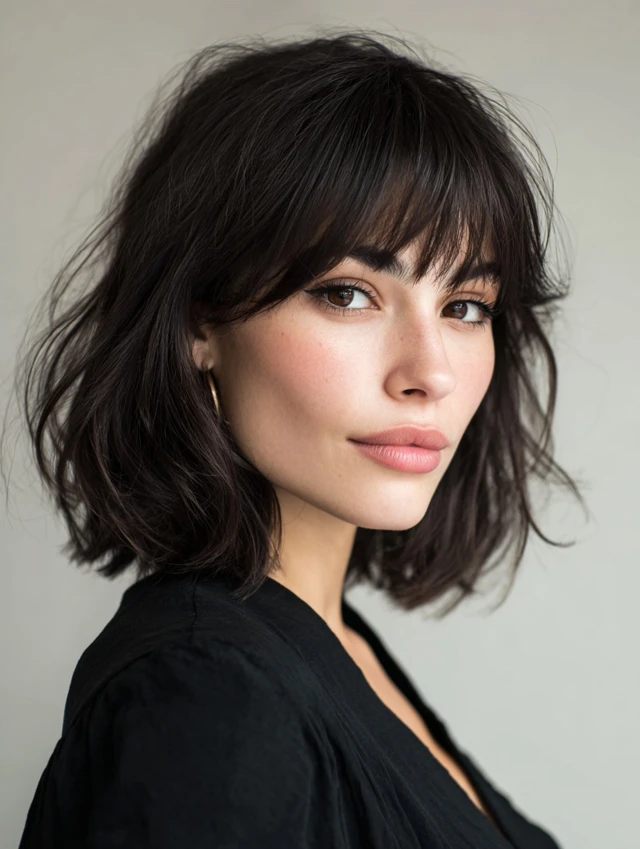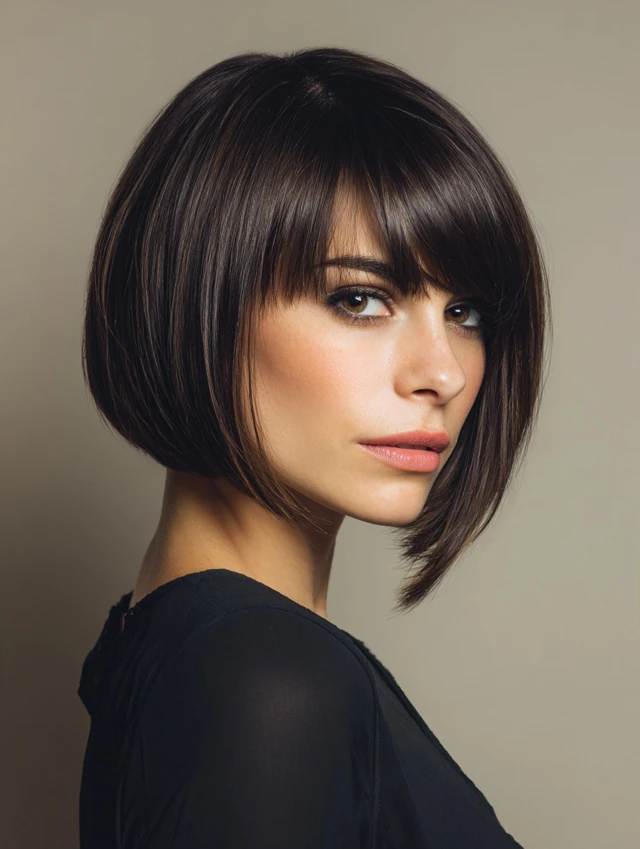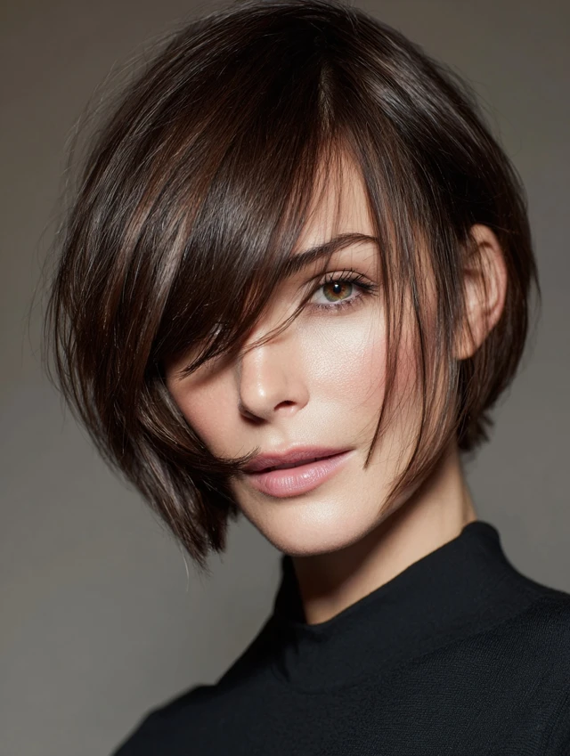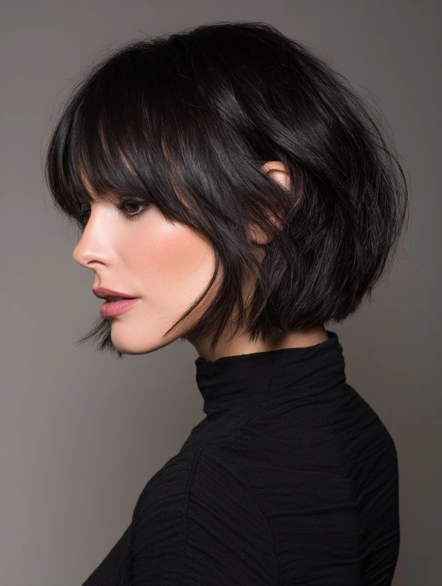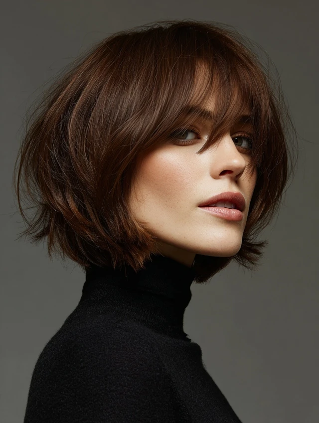 A layered bob that hits around the chin with a side fringe adds lift at the crown and dimension near the temples. It flatters round and square faces by breaking up the forehead area and softening the silhouette.