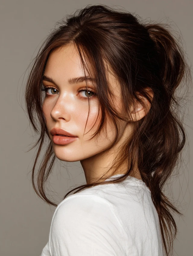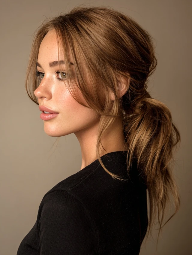 A loose low ponytail looks intentional even on rushed days. Soft strands near the temples and cheeks keep it flattering and relaxed.
