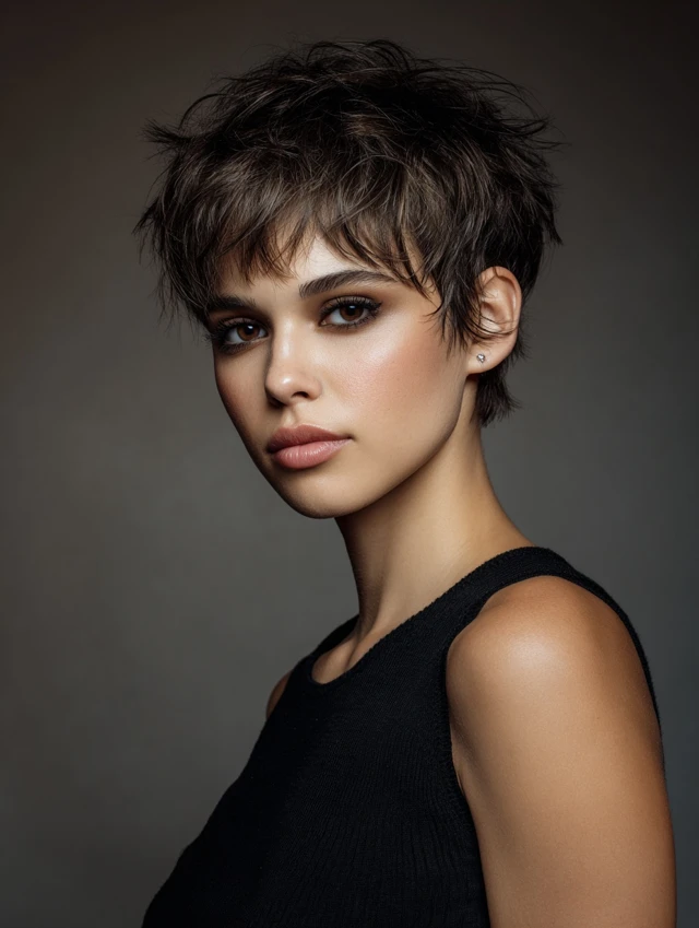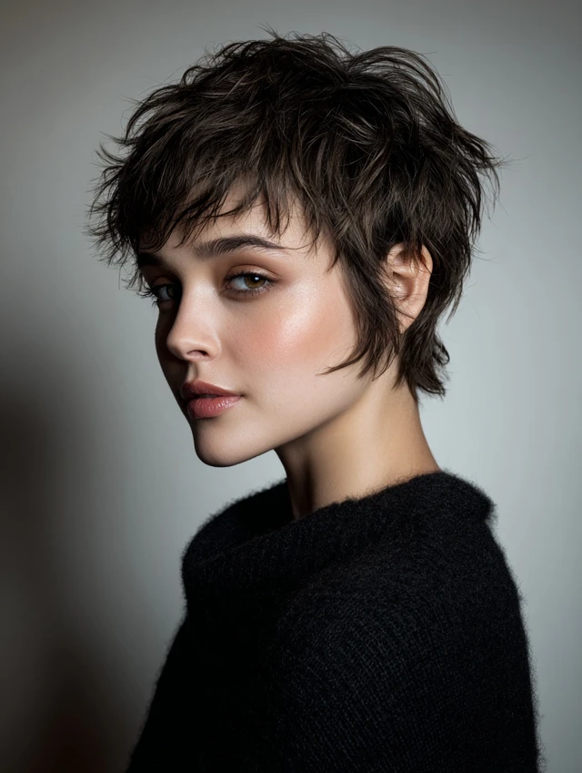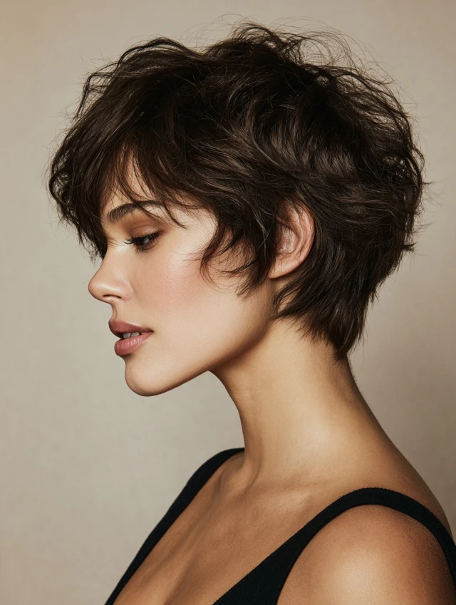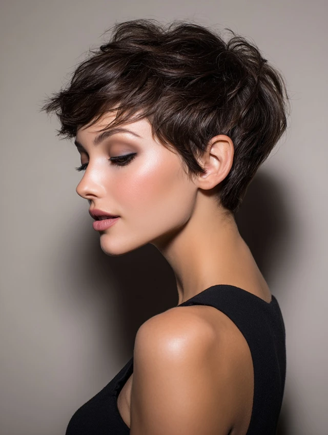 A textured pixie dries in minutes and needs only finger styling. Soft layers on top add volume, while tapered sides keep the silhouette clean.