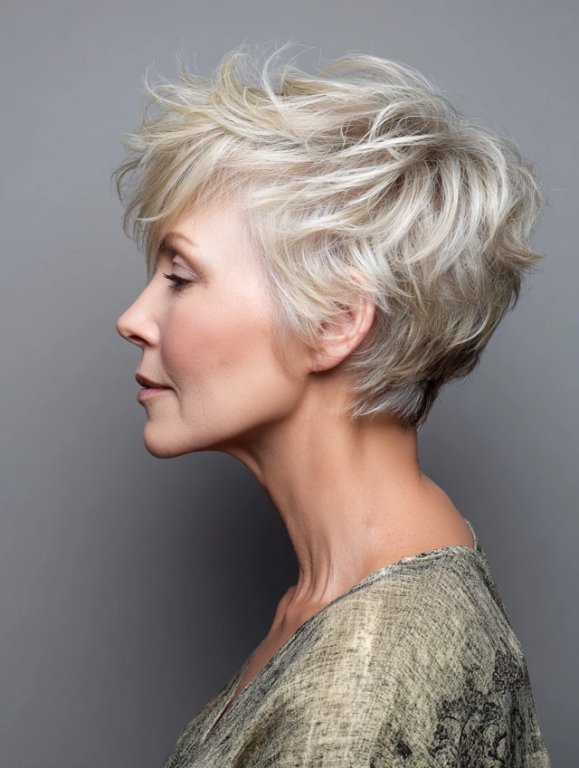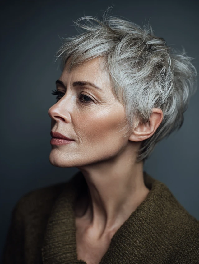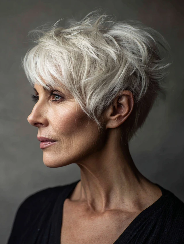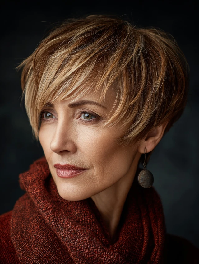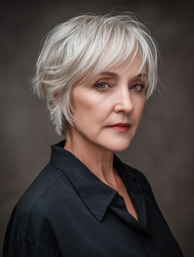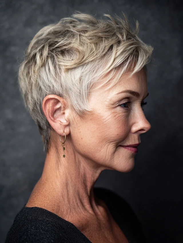 A pixie with soft, choppy layers on top creates instant lift and highlights cheekbones. Tapered sides keep the shape neat, while crown texture adds body. It suits oval and heart-shaped faces especially well.