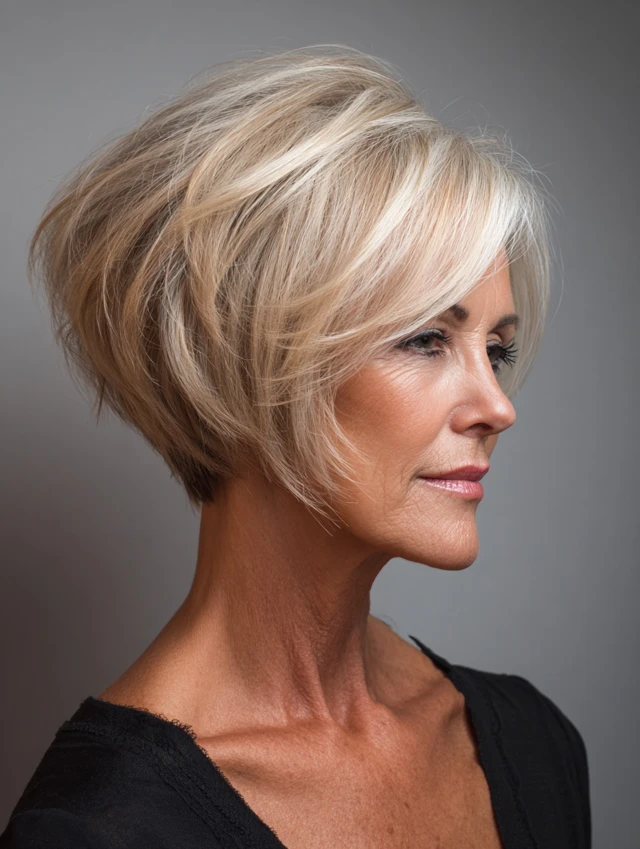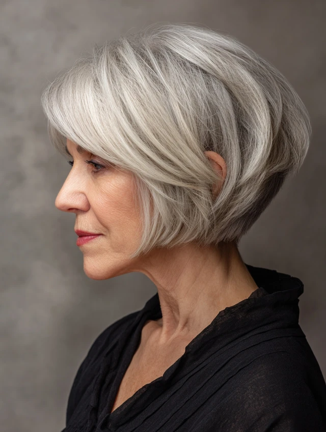 A stacked bob builds volume at the back of the head with graduated layers while keeping the front smooth. It creates a lifted profile and suits round faces by adding vertical height.