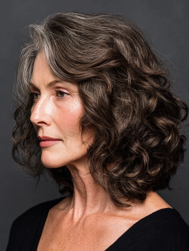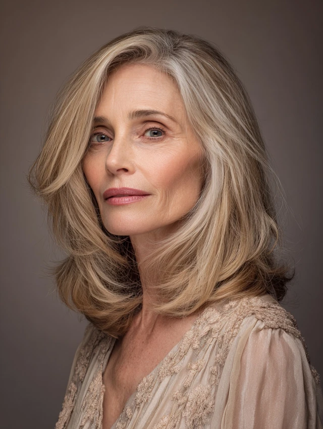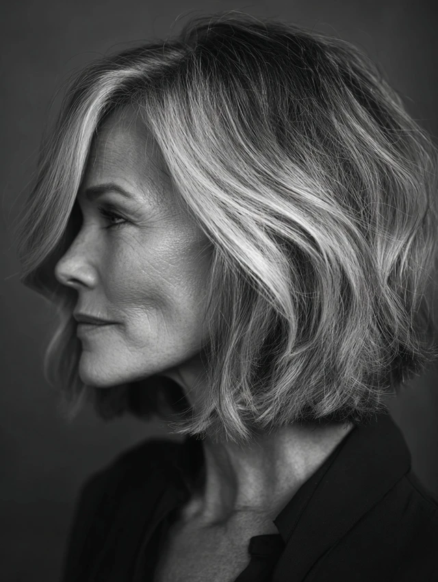 Layers create structure where hair often loses density with age. Shorter sections near the top lift roots, while longer lengths maintain a flattering silhouette around the jaw and shoulders. That combination makes hair appear fuller and more dynamic.