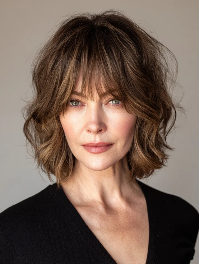 This pairing keeps bangs light and blended into a jaw- or collarbone-length bob. It flatters round and square faces by narrowing the front and lifting the crown. Fine to medium hair benefits because the layers add movement without thinning the ends.