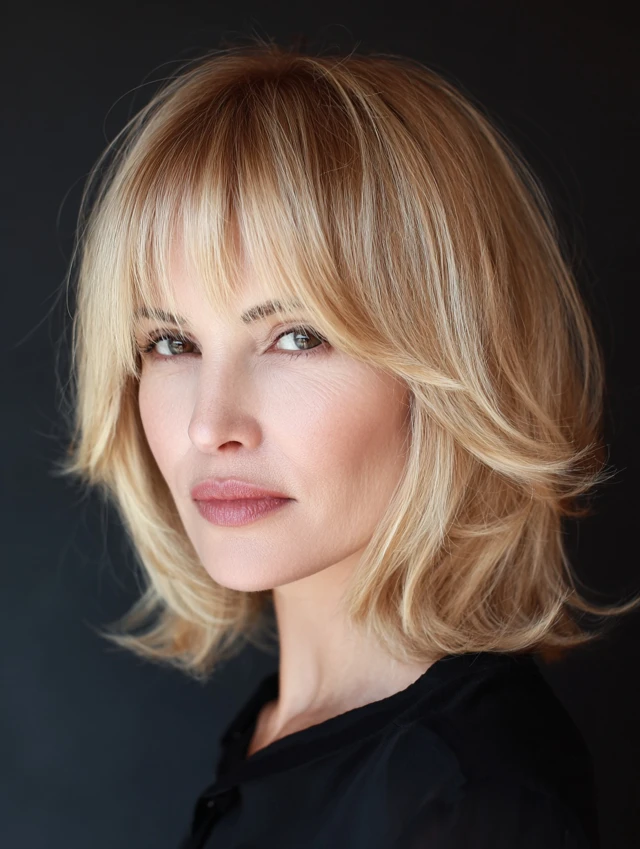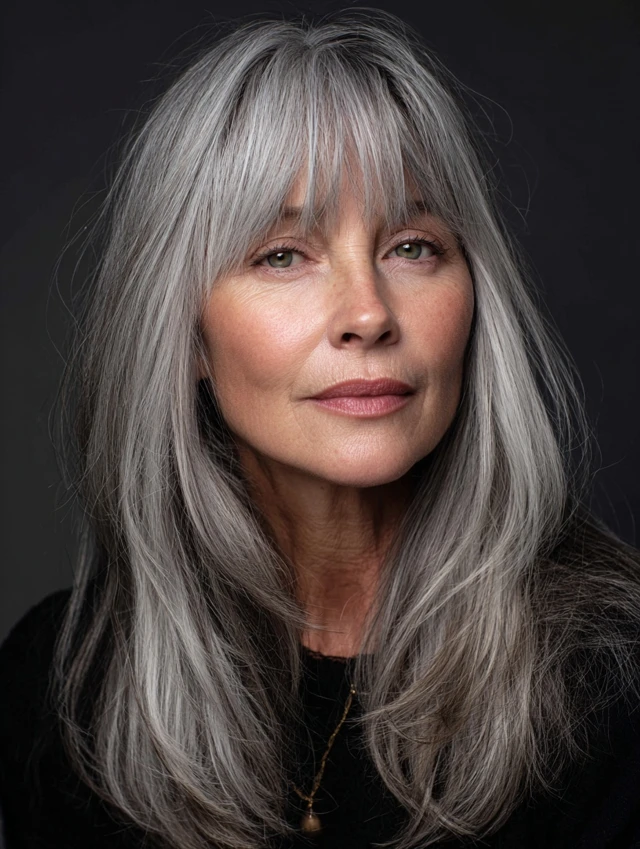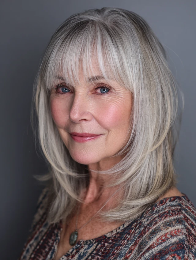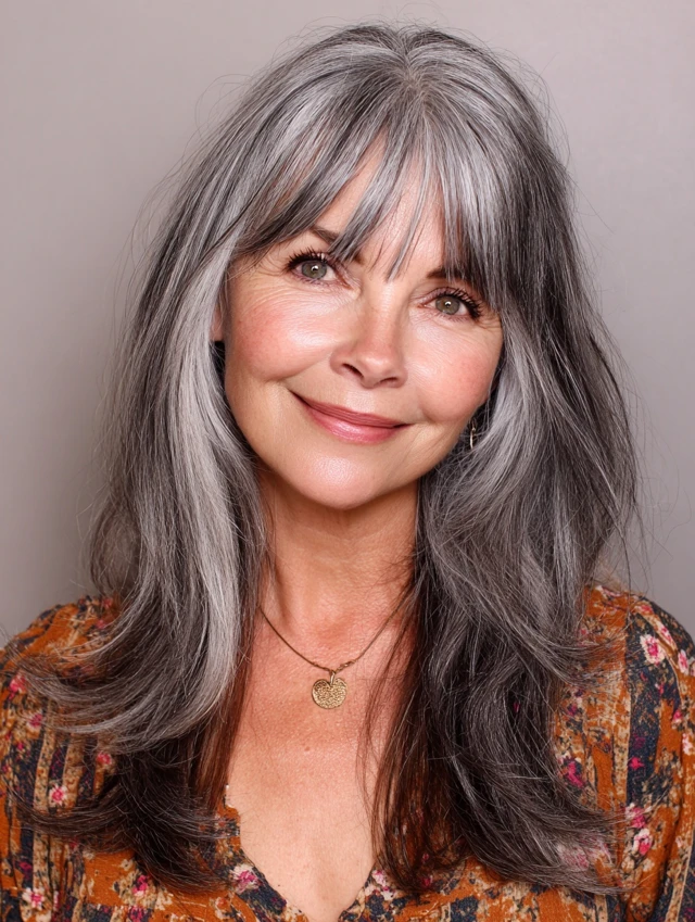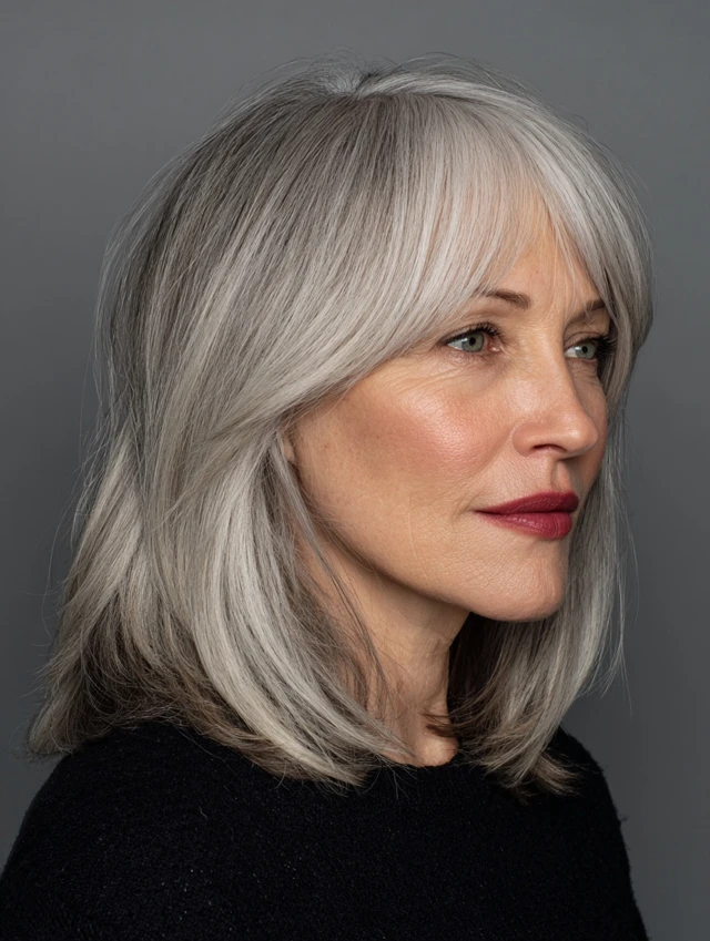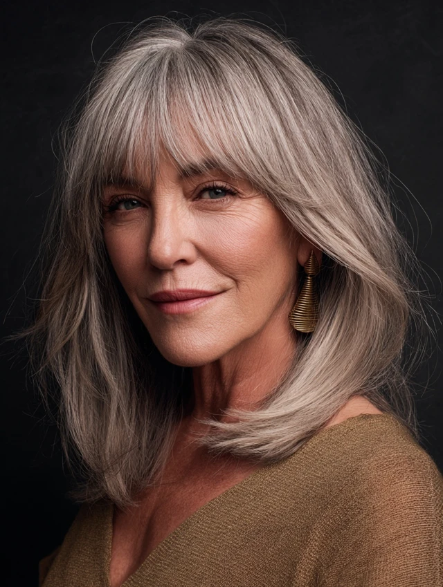 Curtain bangs for women over 50 offer one of the easiest ways to refresh a haircut without losing length or committing to heavy fringe. These parted bangs fall gently to each side of the face, blending into cheek- or jaw-length layers. They soften features, highlight cheekbones, and help disguise thinning near the temples or forehead lines. Many women love them because they grow out gracefully and style quickly. Whether paired with a bob, lob, or long layers, curtain bangs add polish while keeping the look relaxed and natural.