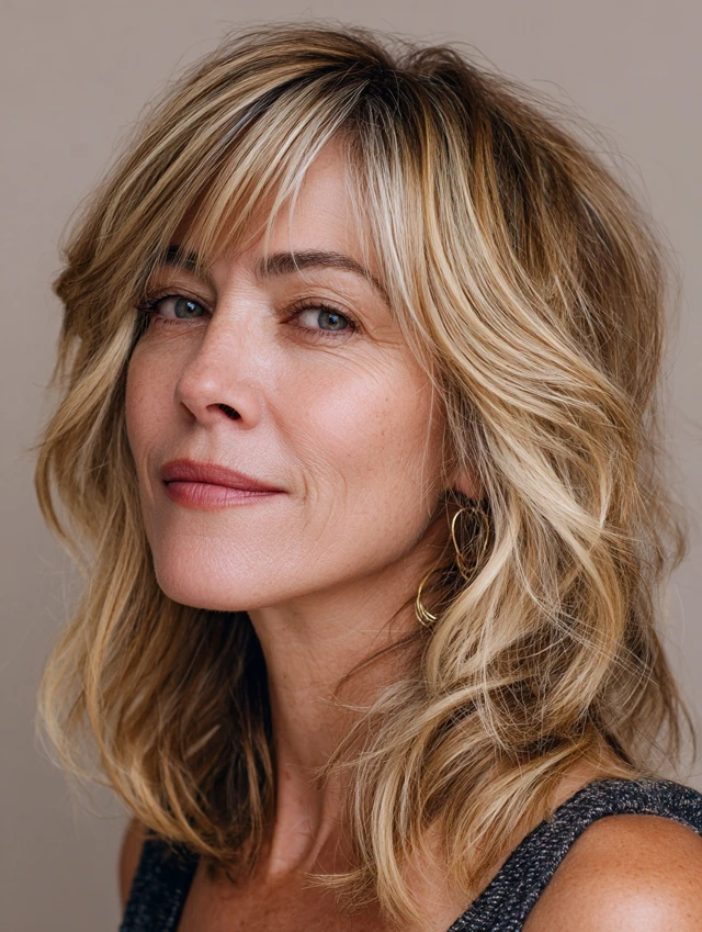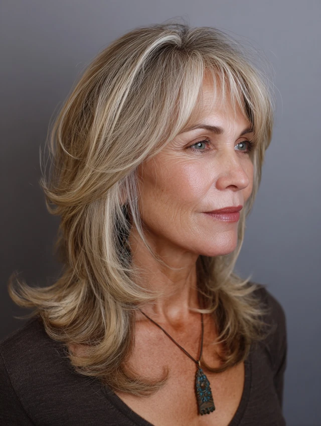 This version uses feather-light ends instead of thick fringe. It creates softness around the eyes without collapsing delicate strands. Women with fine hair often like this approach because it adds shape without sacrificing volume.