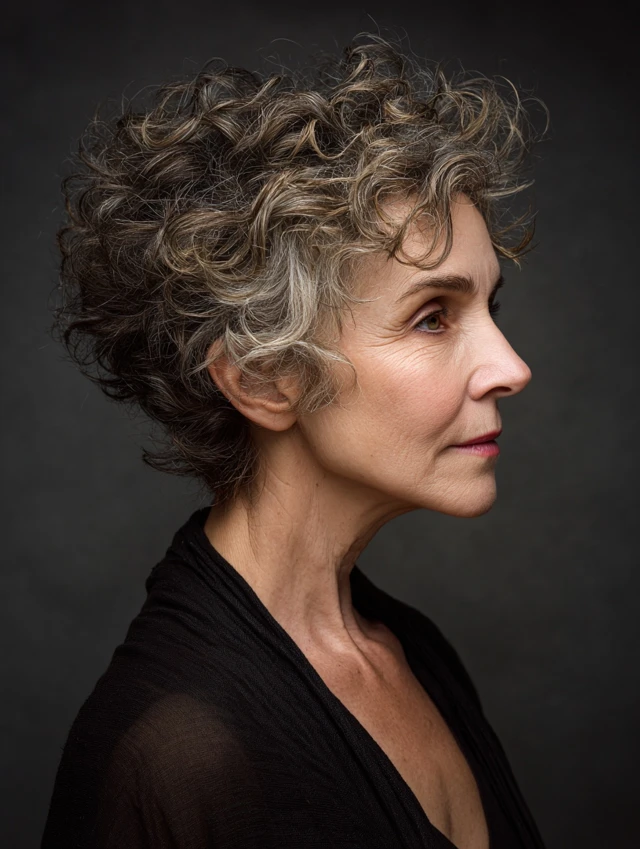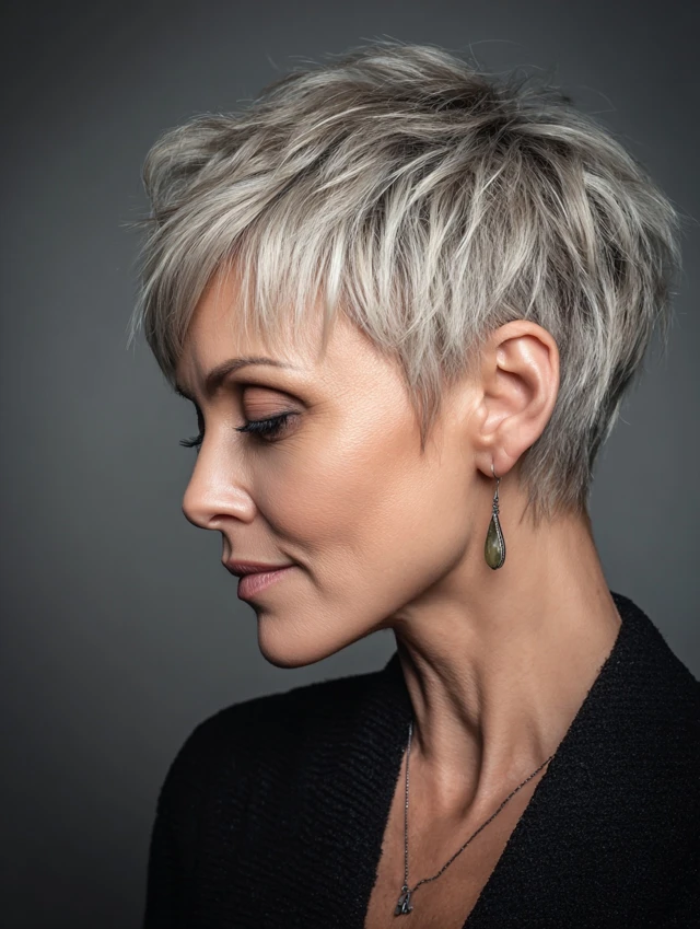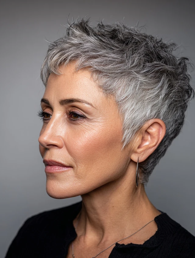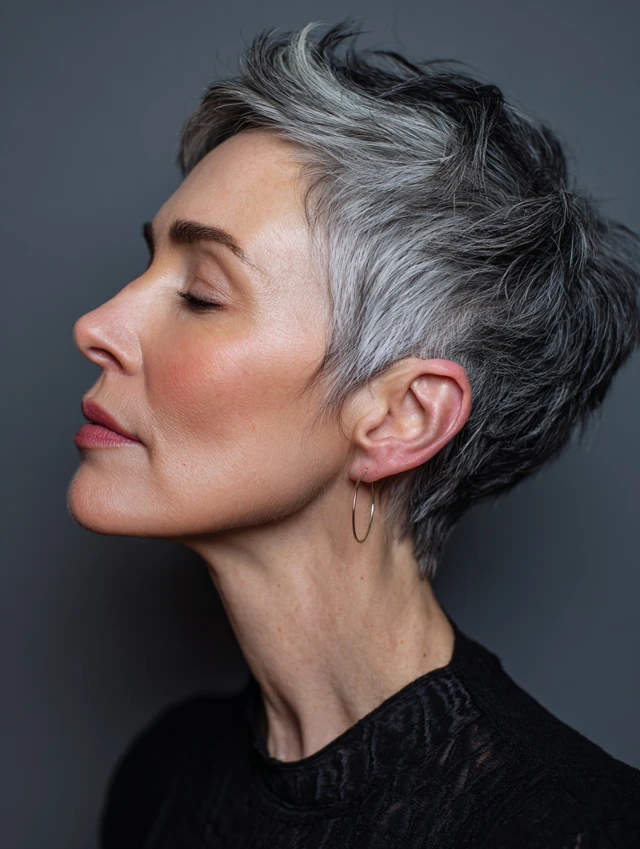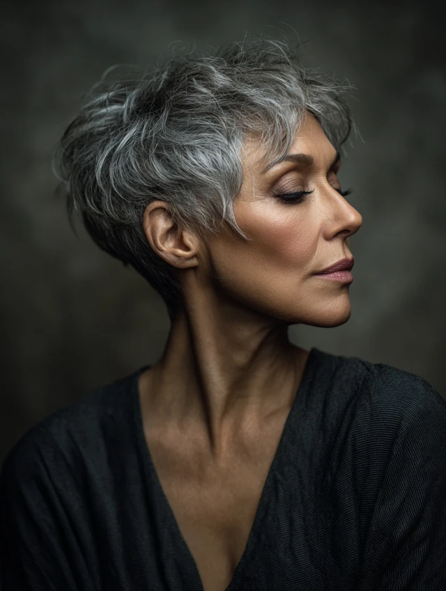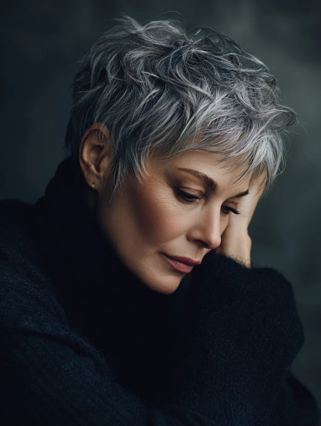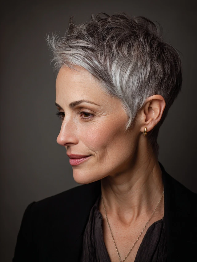 Many mature women are embracing their natural gray, and pixies amplify the dimension. Soft transitions between gray and darker tones add depth and visual texture.