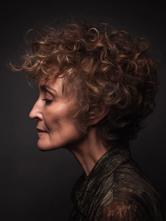 Scrunch curl cream into damp hair and diffuse gently. Avoid over-brushing once dry. The curls frame the face and add youthful movement.