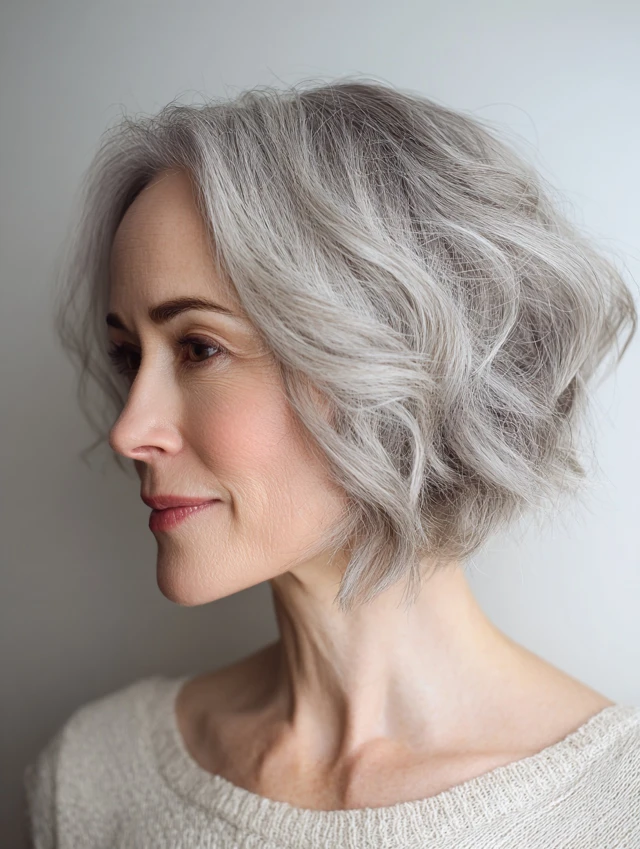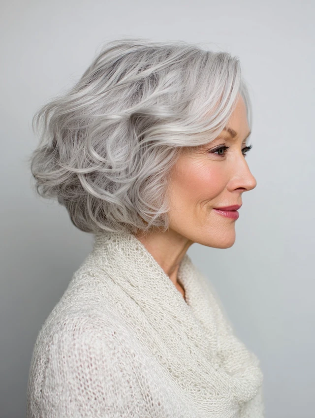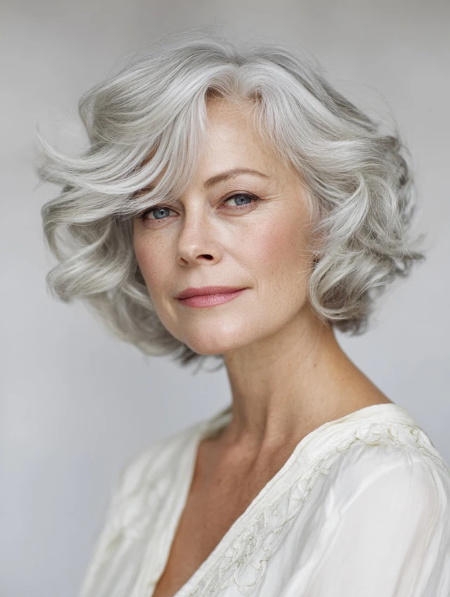 A chin-length bob with soft waves shows off gray tones and adds a graceful swing to the cut. It flatters almost every face shape, especially those with angular features. Wavy textures show dimension without daily heat styling.