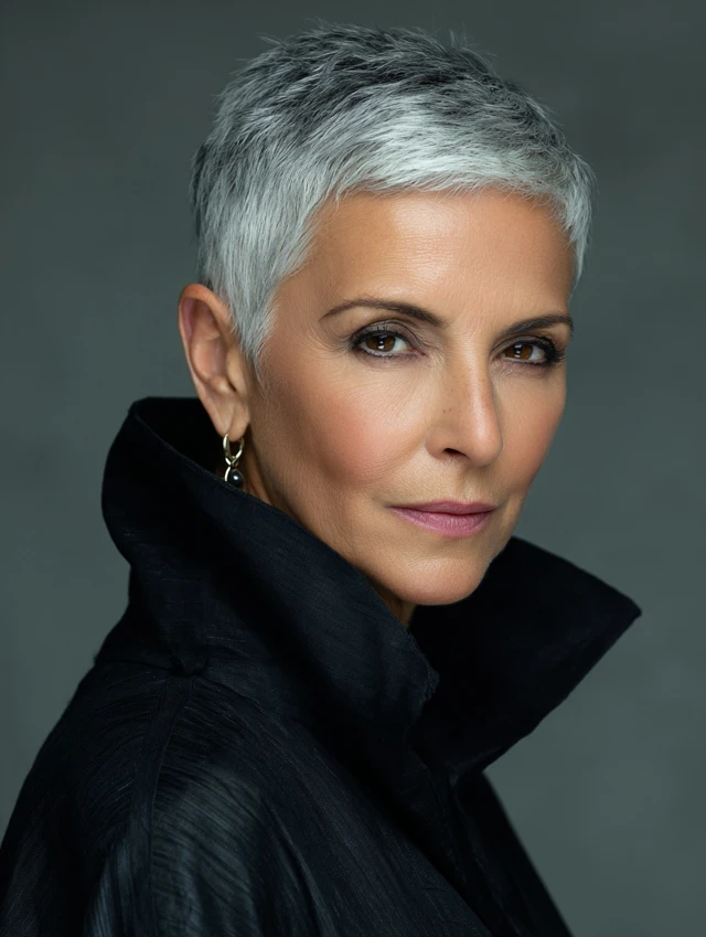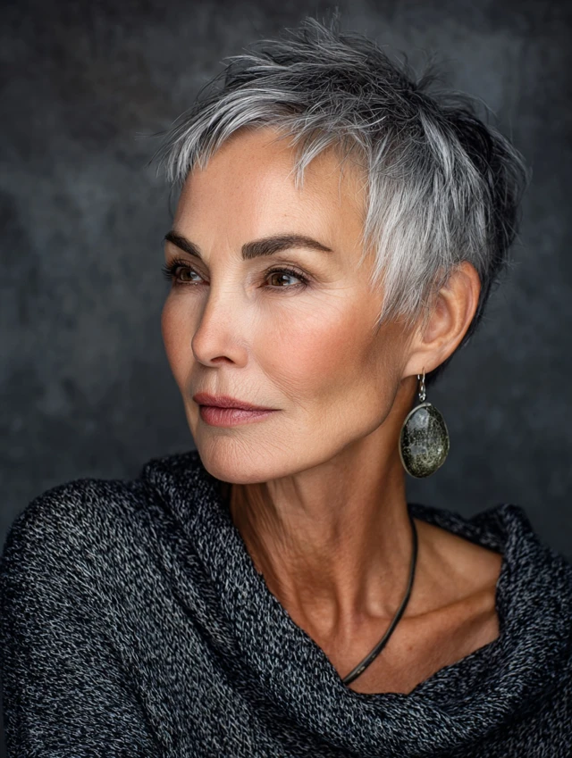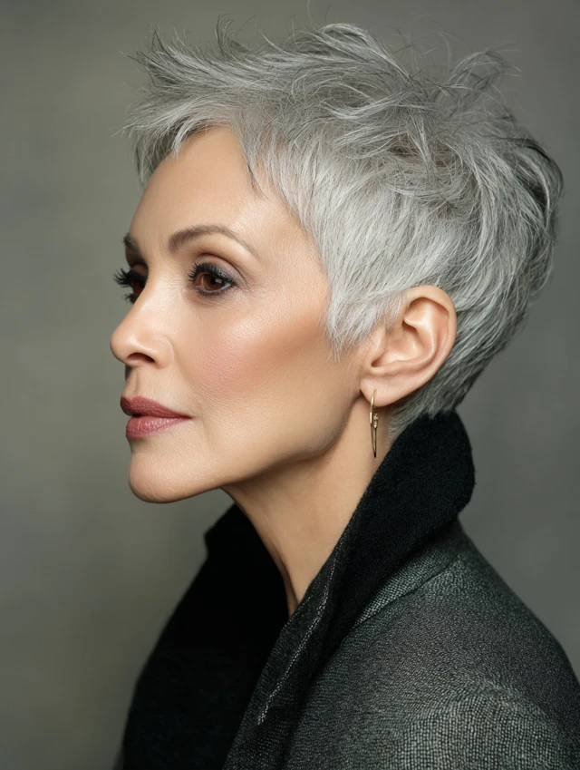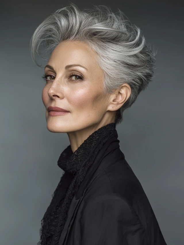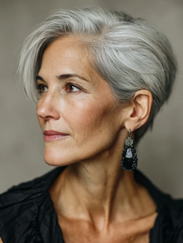 Choose cuts that lift at the crown and keep weight off the sides and back. Ask for face-framing pieces rather than blunt, heavy edges. Use lightweight products so gray doesn’t look dull or weighed down. Avoid heavy gels or creams near the roots. Regular trims matter more than daily styling here—fresh shaping keeps short gray cuts looking deliberate and tidy.
