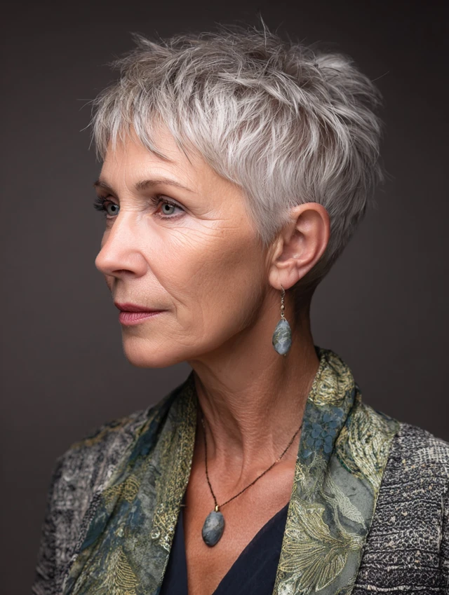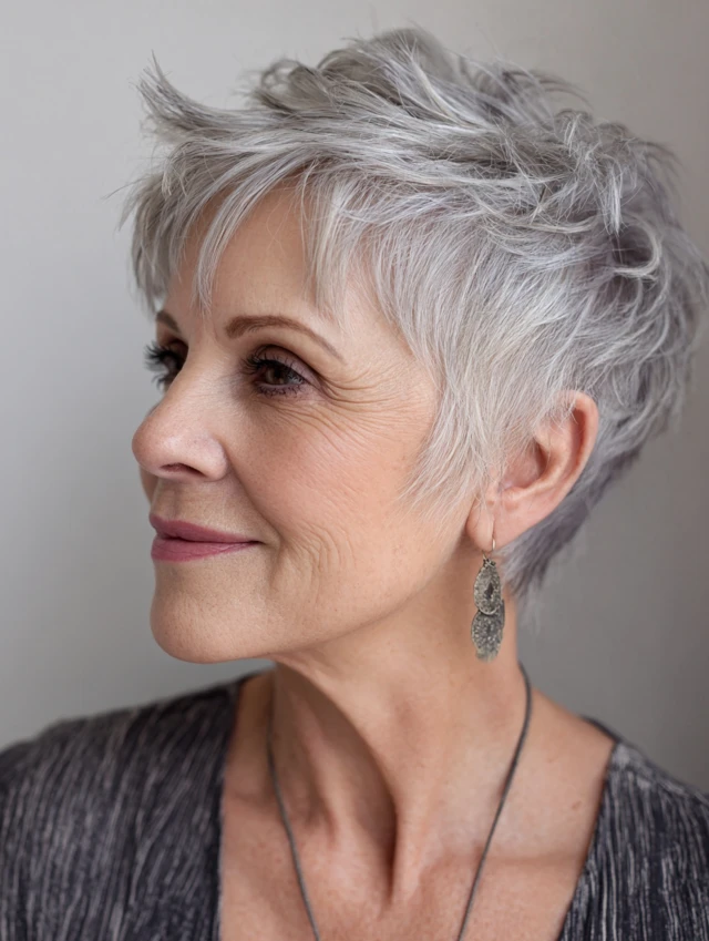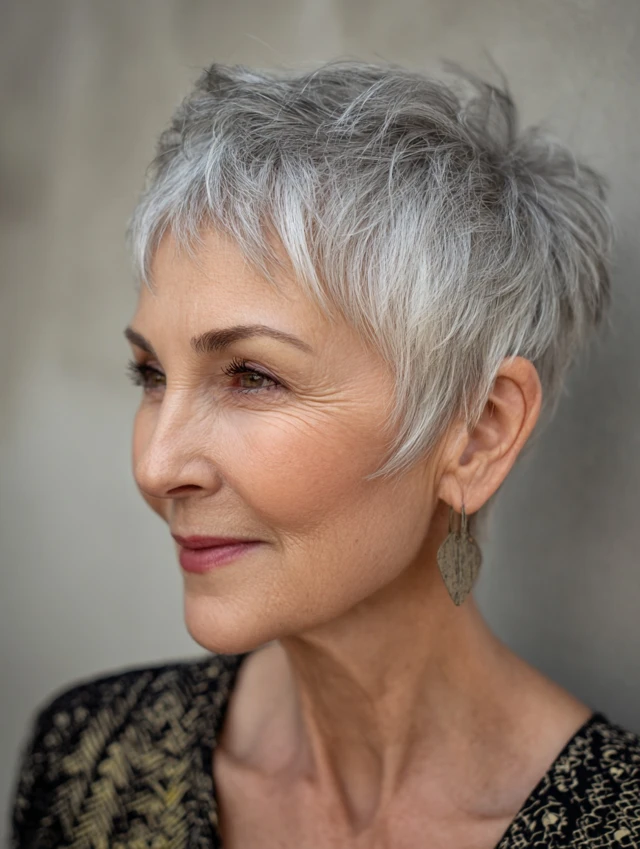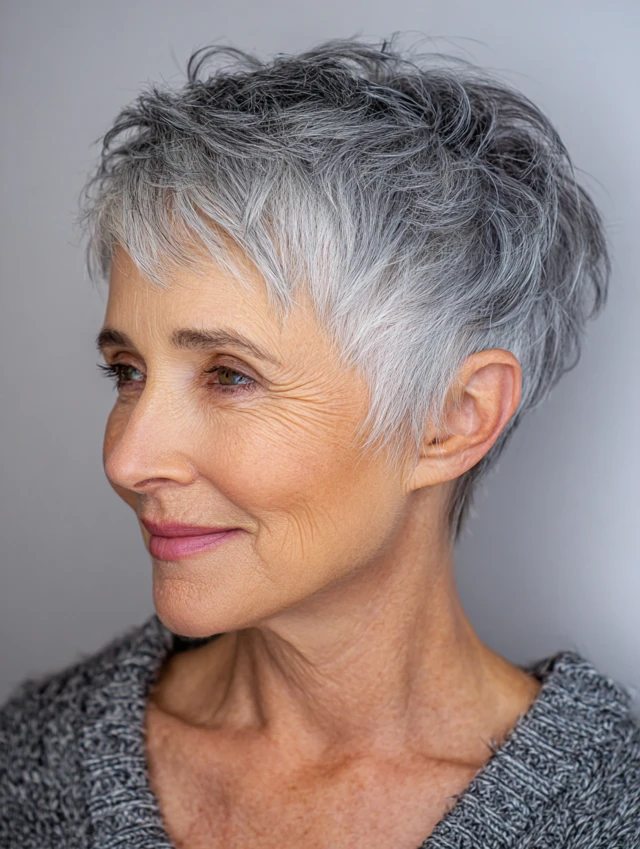 Soft layers throughout this pixie cut add lift and movement while showing off natural gray. It suits oval and heart-shaped faces because the crown gets height and the sides stay neat. Fine to medium hair benefits most from light layering.