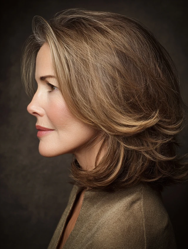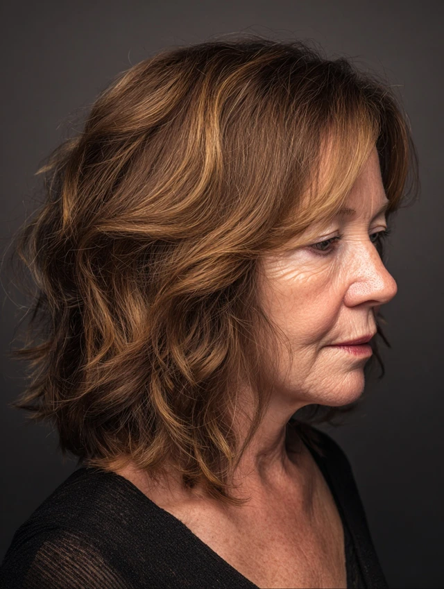 This mid-length option stays flexible and low stress. Face-framing pieces soften the front, while long layers through the back add flow. It works across straight, wavy, or lightly curly textures.