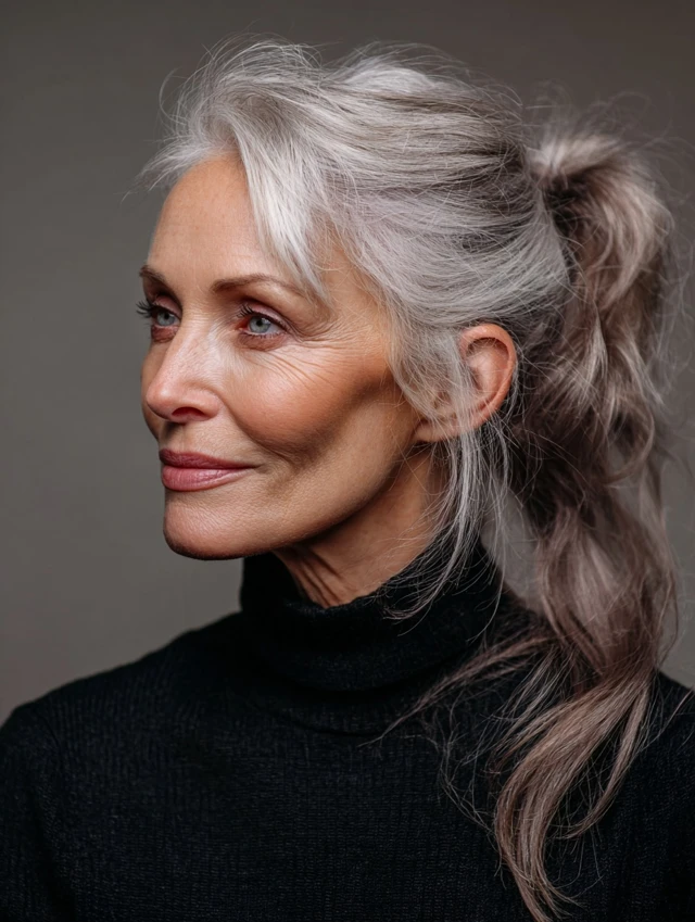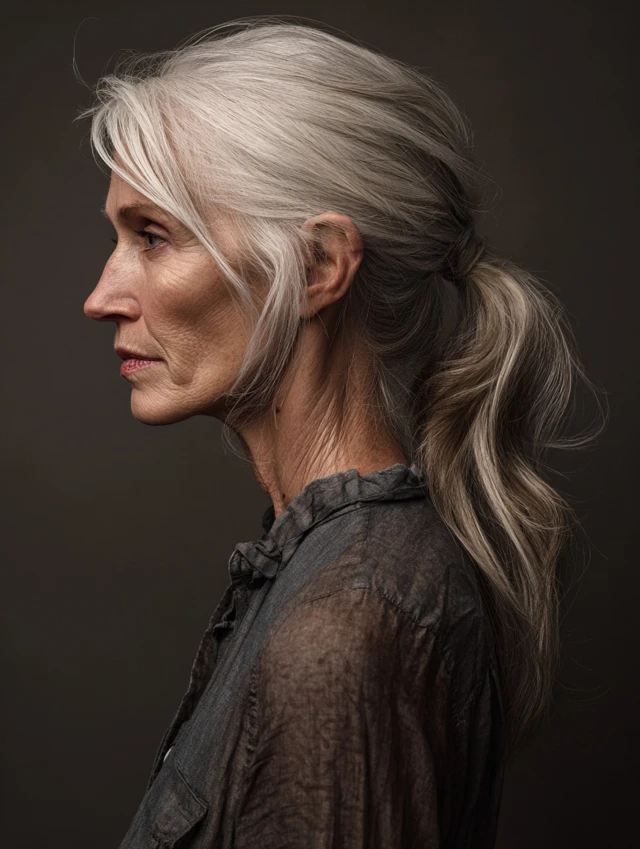 A loose low ponytail paired with wispy front pieces feels neat without looking strict. It suits most face shapes and works for nearly all hair types. Fine hair looks fuller when the crown lifts slightly.