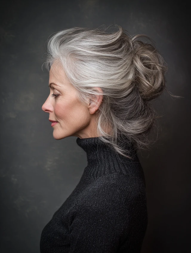 Tease lightly before securing with a clip or elastic. Curl the loose hair slightly for softness. The result feels effortless but intentional.