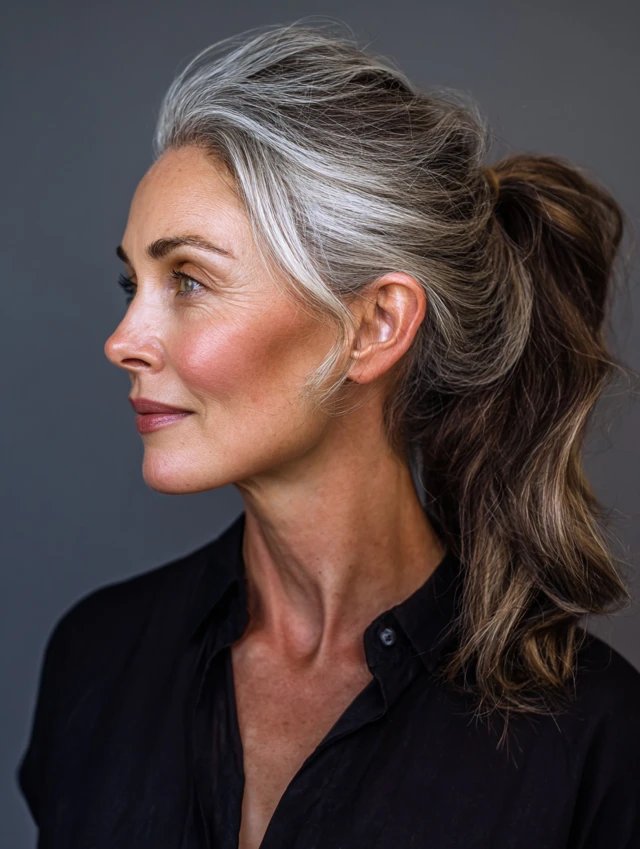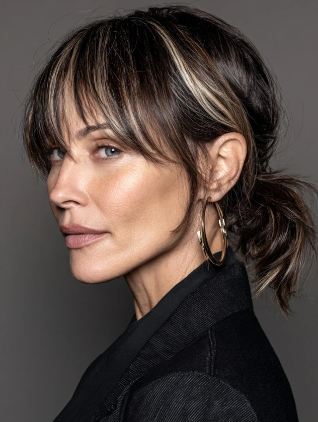 A low ponytail at the nape paired with soft front layers reads clean and confident. It suits most face shapes and works across straight, wavy, or curly textures. Fine hair looks fuller with a little crown lift.