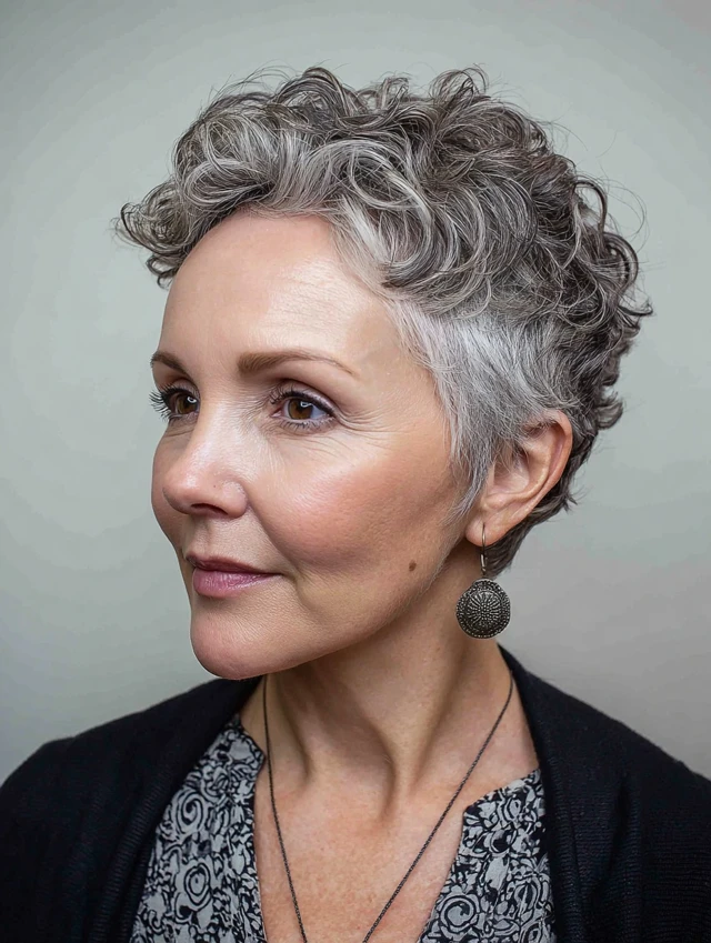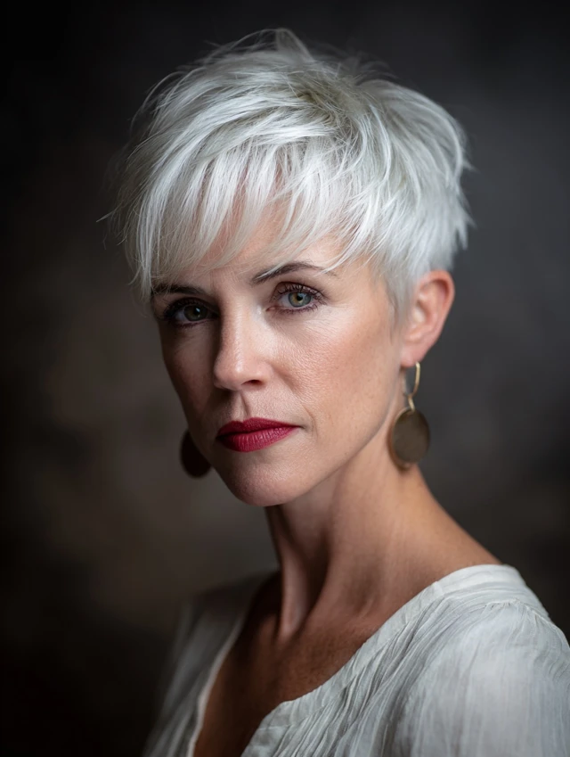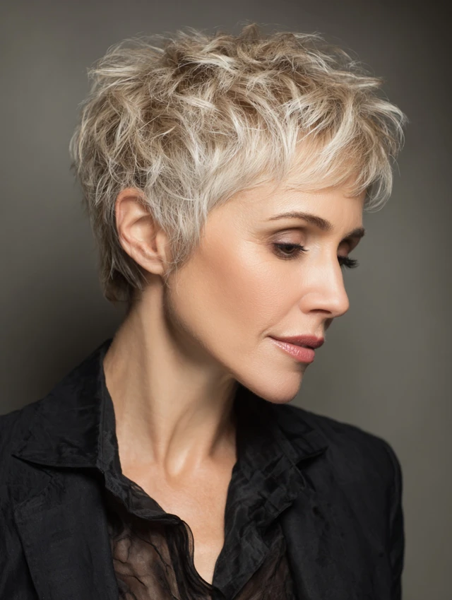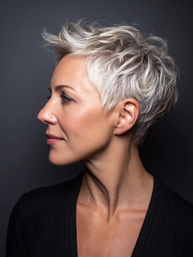 A textured pixie keeps the sides neat while adding softness on top. It highlights cheekbones and suits oval or heart-shaped faces well. Fine hair gains fullness from crown layers, while thick hair stays controlled.