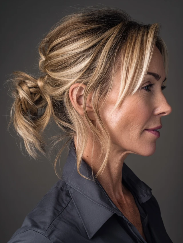 Brush hair back loosely, secure low, and pull a few strands forward. This look works for meetings, presentations, and long desk days.
