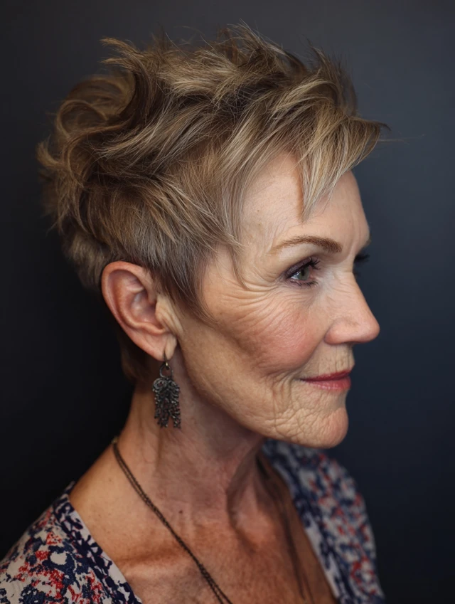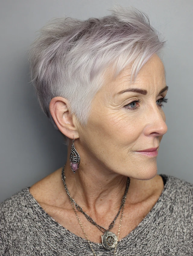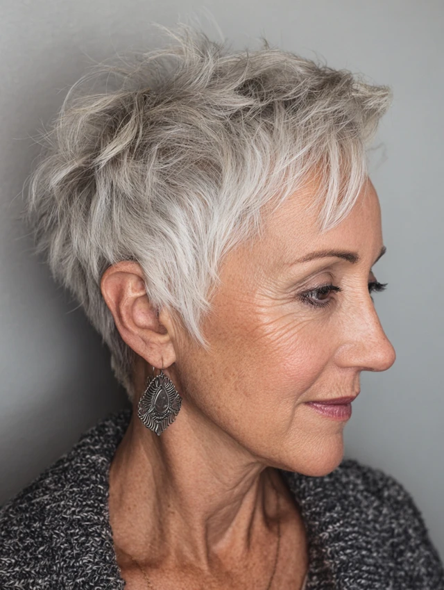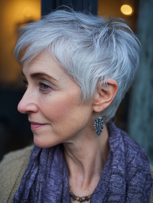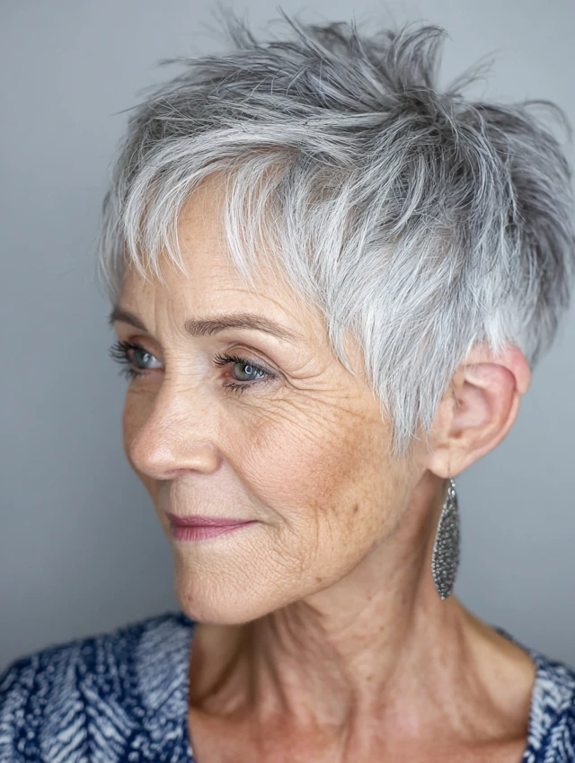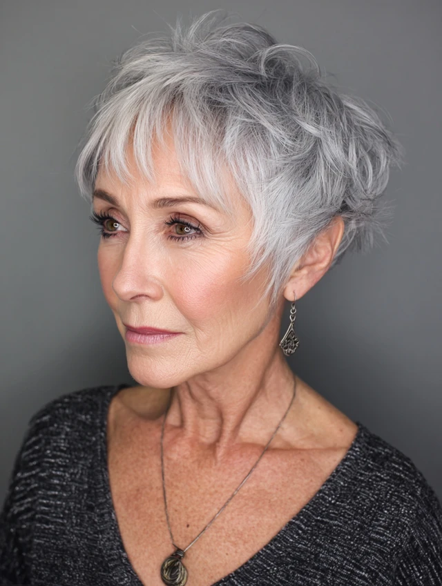 There’s something quietly empowering about gray pixie cuts for older women. Short hair emphasizes texture, frames the face, and makes gray hair feel intentional and stylish. A pixie cut is low-maintenance, flattering, and full of personality.