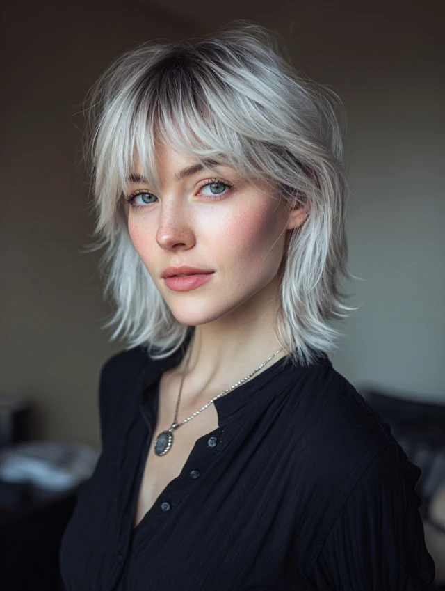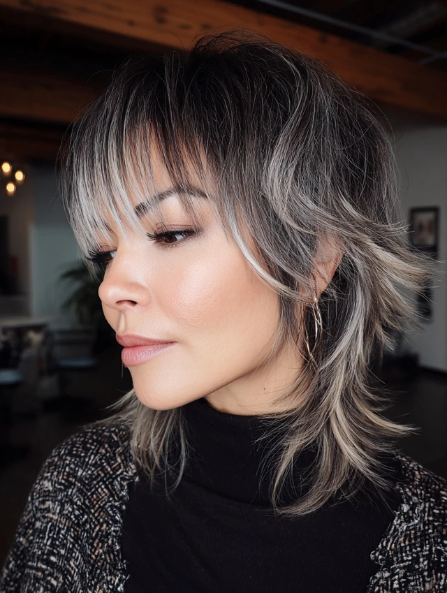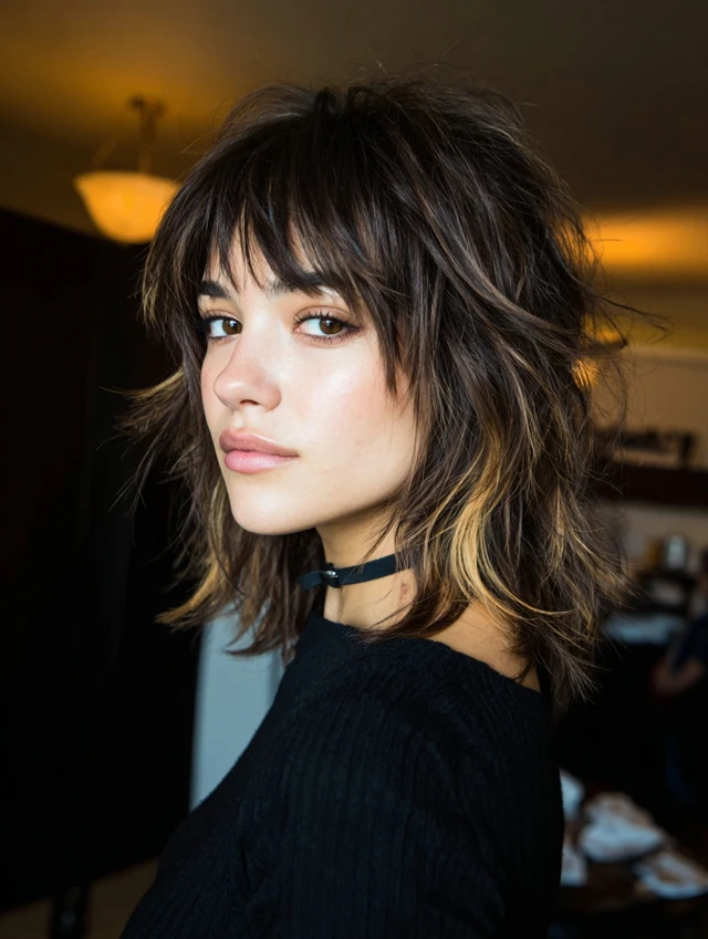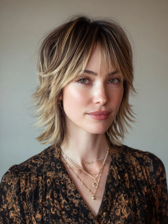 A short balayage wolf cut keeps length near the jaw while stacking soft layers through the crown. Wispy bangs lighten the forehead and blend into cheek-level pieces. Painted highlights brighten the top sections, boosting volume visually.