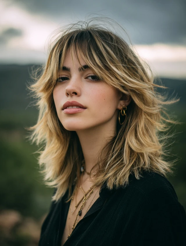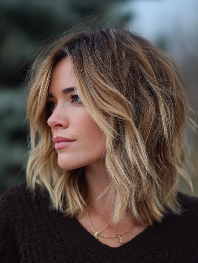 A collarbone-length balayage wolf cut balances structure and movement with stacked crown layers and feathered tips. The length allows half-up styles, while soft color placement brightens the mid-sections and ends. The silhouette feels airy rather than bulky.