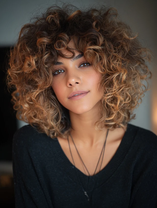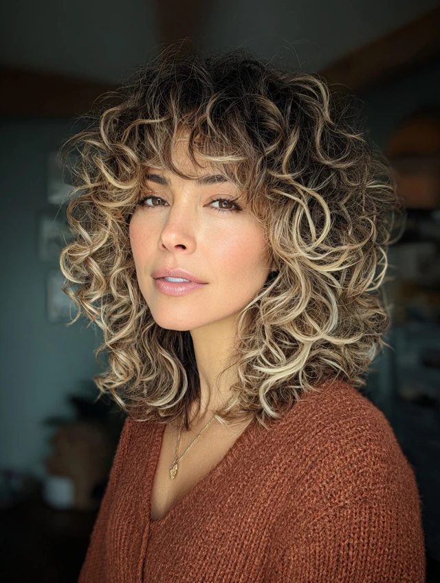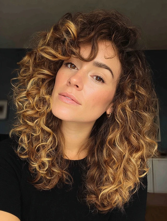 A curly balayage wolf cut uses rounded crown layers to keep volume controlled while letting curls spring freely. Painted highlights catch the curves of each curl, creating depth without harsh contrast. The longer back stays light thanks to tapered ends, which prevents heaviness.