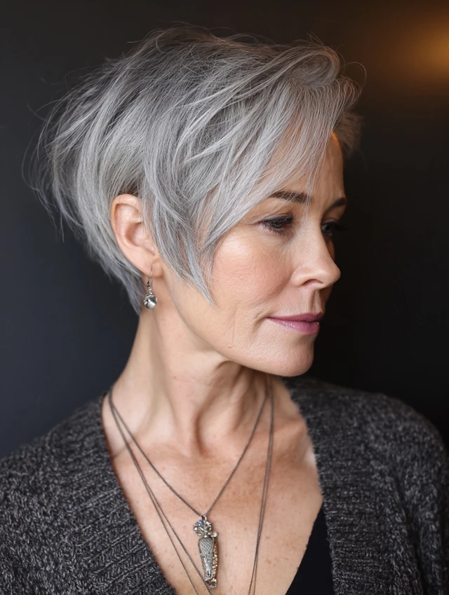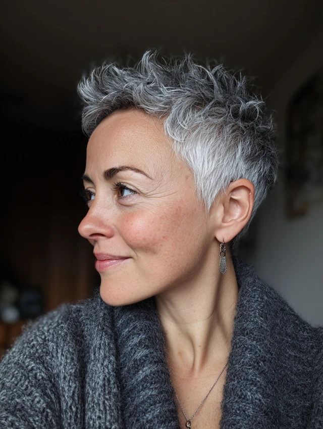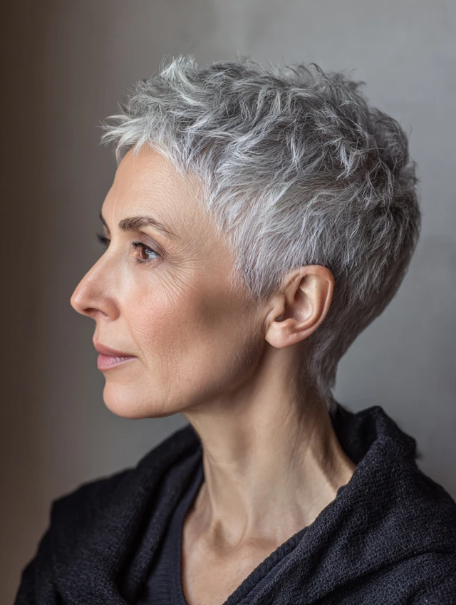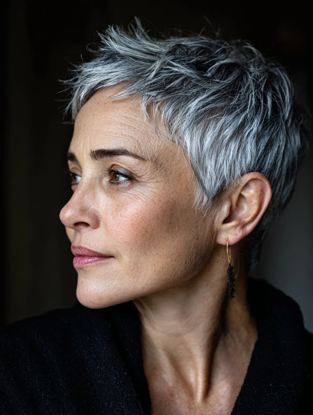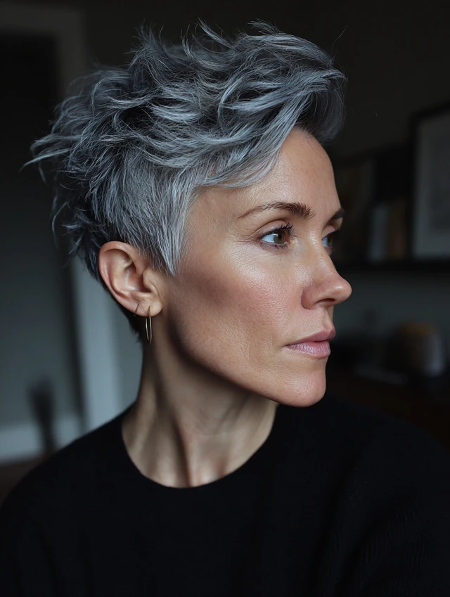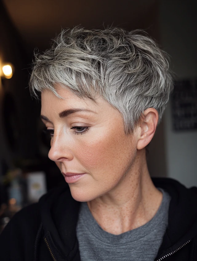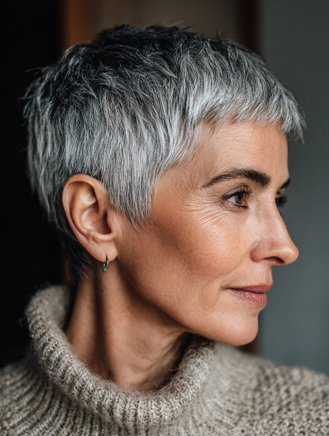 A tapered pixie accelerates the transition by showcasing natural silver at the crown and hairline. Cropped sides minimize leftover color, while a textured top keeps volume high. The result feels confident, modern, and deliberate.