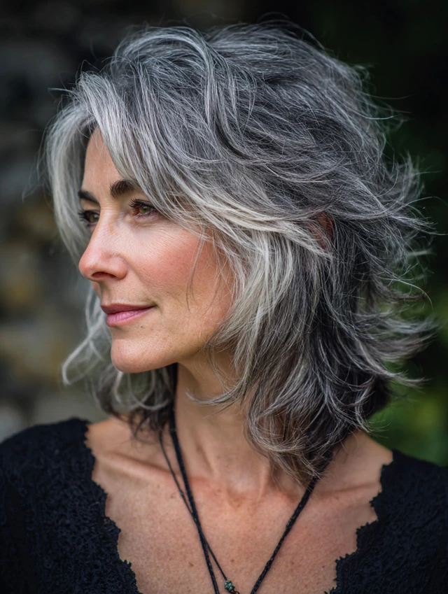 A soft shag creates movement that helps camouflage harsh color lines between dyed strands and new gray growth. Feathered layers scatter contrast across the head, making the transition appear gradual instead of obvious. The relaxed shape keeps everything modern rather than patchy.