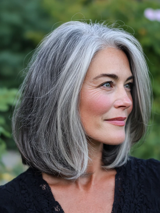 A shoulder-length cut with face-framing pieces pulls attention away from strong color demarcation lines. Shorter front layers draw focus toward the eyes and cheekbones instead of the roots. Soft ends keep the silhouette fluid while you grow out gray naturally.