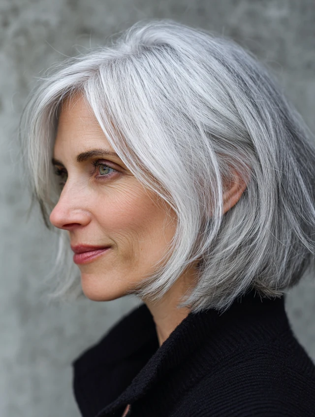Most hair textures handle this cut well, especially straight or wavy types. Blow-dry quickly or air-dry with smoothing cream. It suits offices, travel days, and casual weekends. Trims every eight weeks refresh the shape without removing too much gray progress.