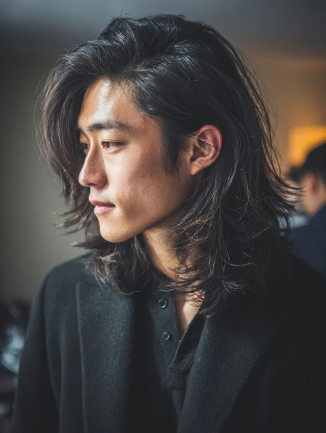 A layered medium-length Korean hairstyle keeps the top flowing while tapering the sides lightly. The length allows styling flexibility, from loose waves to slicker finishes. Feathered layers prevent heaviness and frame the face naturally.