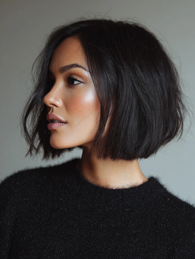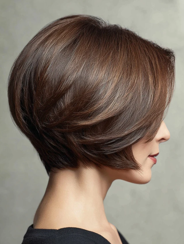 A stacked bob uses graduated layers in the back to create a rounded profile and visible lift. The buildup of shorter sections adds fullness at the crown, which thin hair often lacks. Slightly longer front pieces maintain softness around the face and prevent a severe finish.