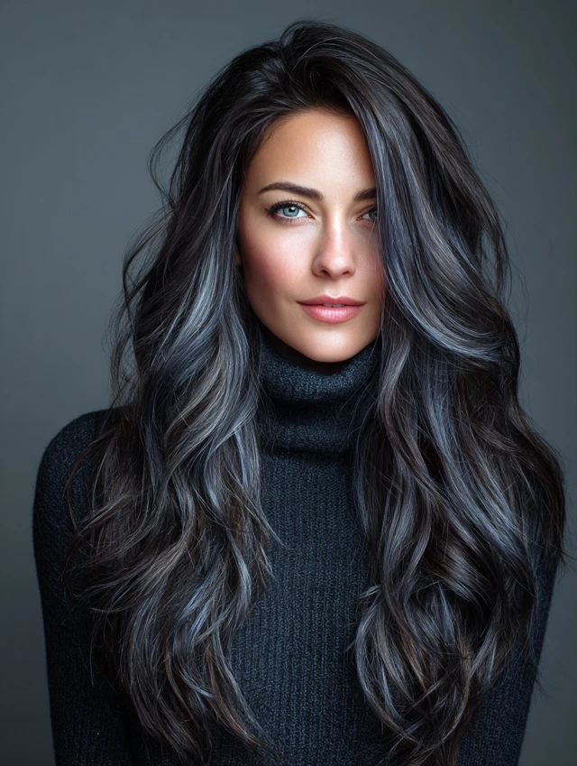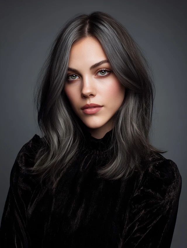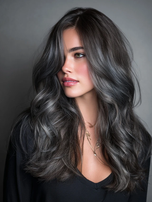 Charcoal brunette deepens dark hair with smoky, cool undertones instead of flat black pigment. The color adds richness and shine while keeping dimension visible under light. Subtle lighter ribbons prevent the shade from feeling heavy.