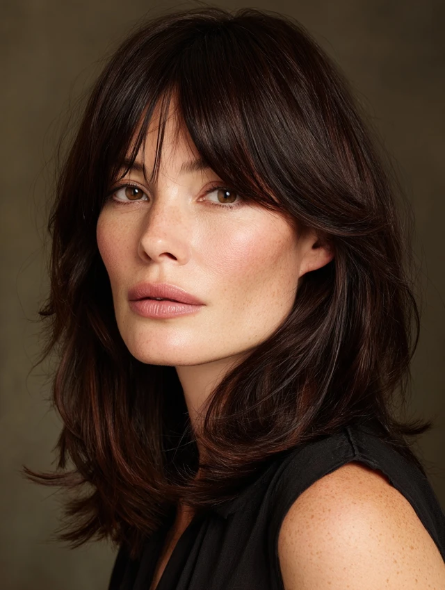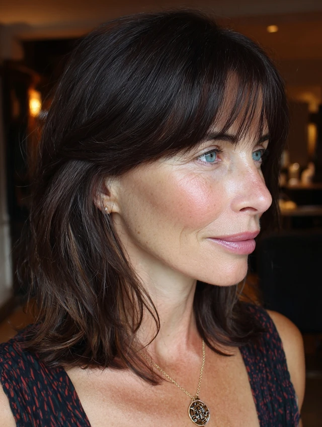 This option suits most hair types, from fine strands to thicker waves. Blow-dry bangs using a paddle brush, then add light bend through the ends. It feels practical for daily wear and easy to refresh between washes. The look transitions well from casual outings to evening dinners without much effort
