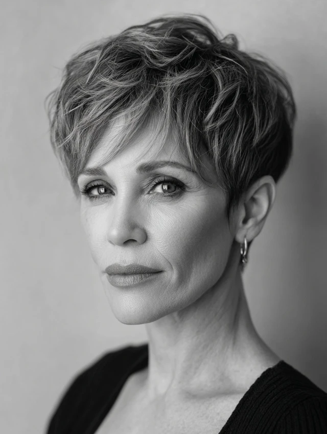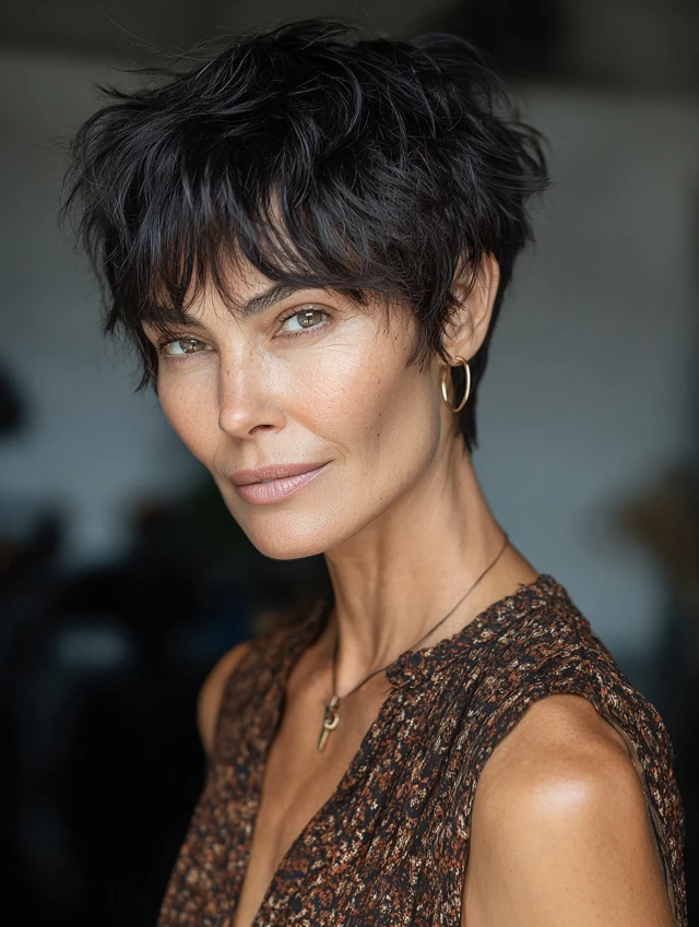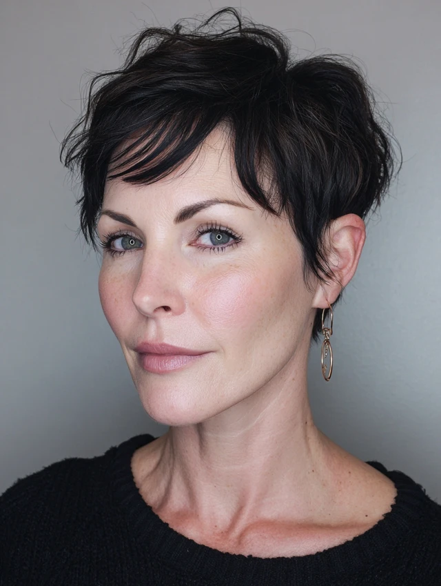 A textured pixie paired with a longer fringe softens square jawlines while adding lift at the crown. The extended front section creates diagonal lines across the face, which helps counter strong corners. Choppy layers also prevent the cut from looking too rigid or severe.