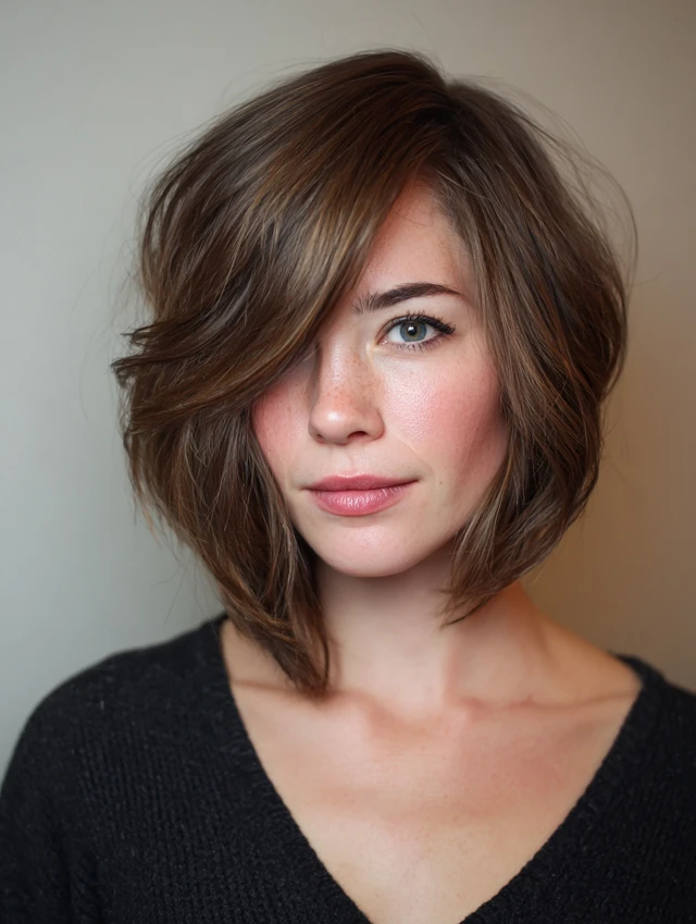 Side-swept bangs or layers falling below the chin to create a slimming effect.
