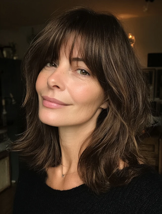 This style suits straight, wavy, and slightly curly hair types. Blow-dry bangs first, then air-dry the rest. It fits professional settings and weekend outings. Fringe trims every three to four weeks keep the look sharp.