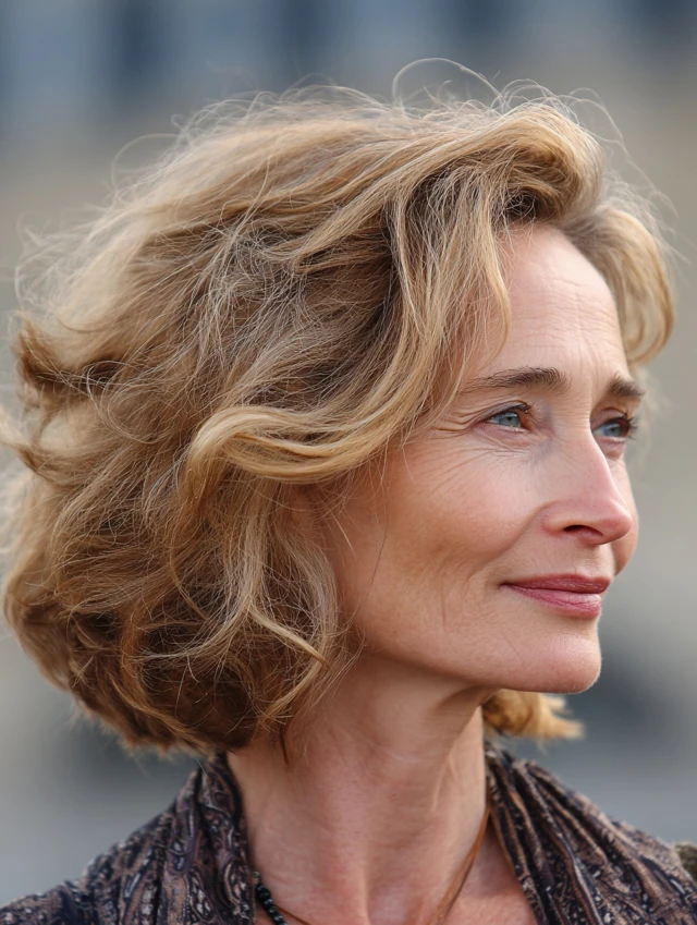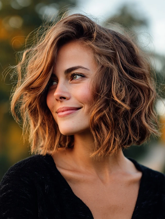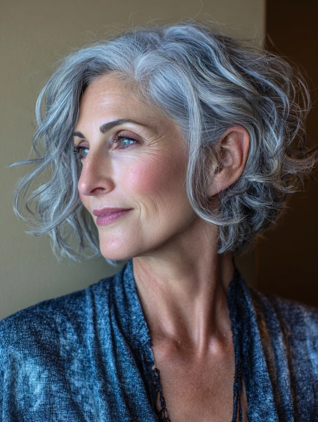 A wavy medium cut paired with a side part adds lift at the crown and reduces emphasis on symmetrical lines. The waves create softness, while the angled part reshapes proportions gently. This approach keeps the style relaxed yet polished.