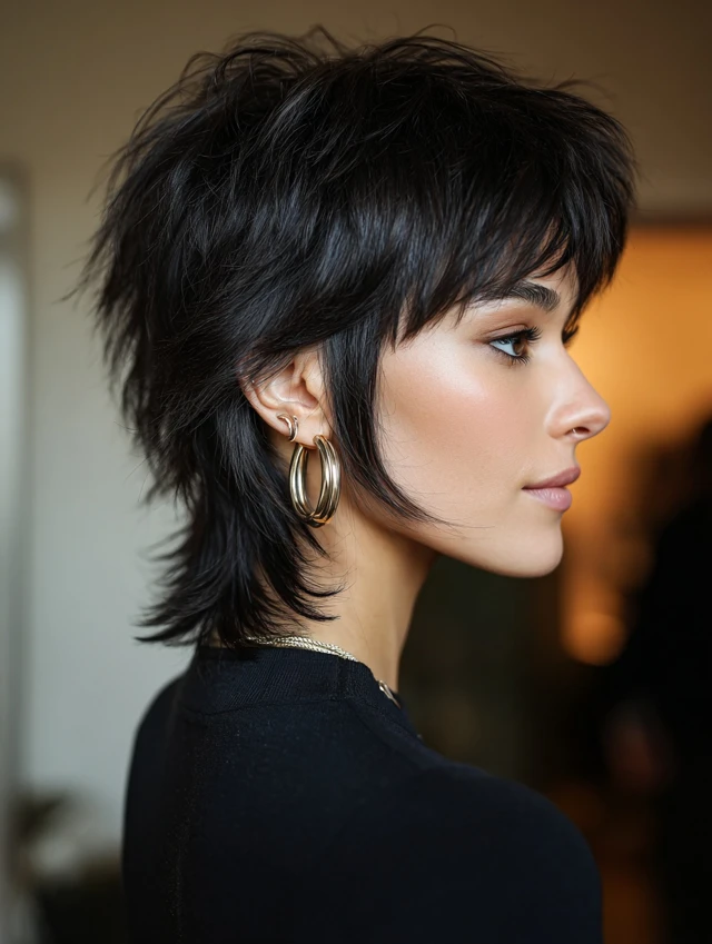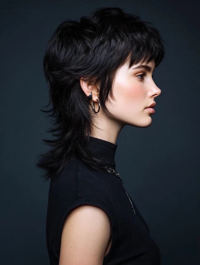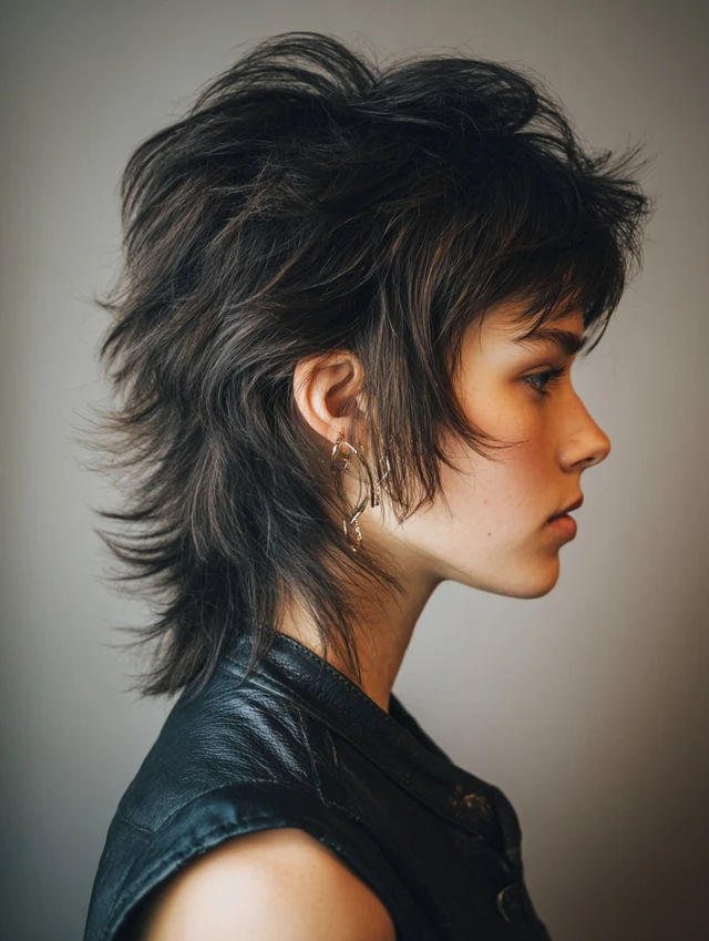 A shorter mullet wolf cut focuses on lift at the crown and keeps the back neatly tapered. The contrast creates drama while staying controlled. Choppy layers add fullness and prevent the silhouette from collapsing flat.