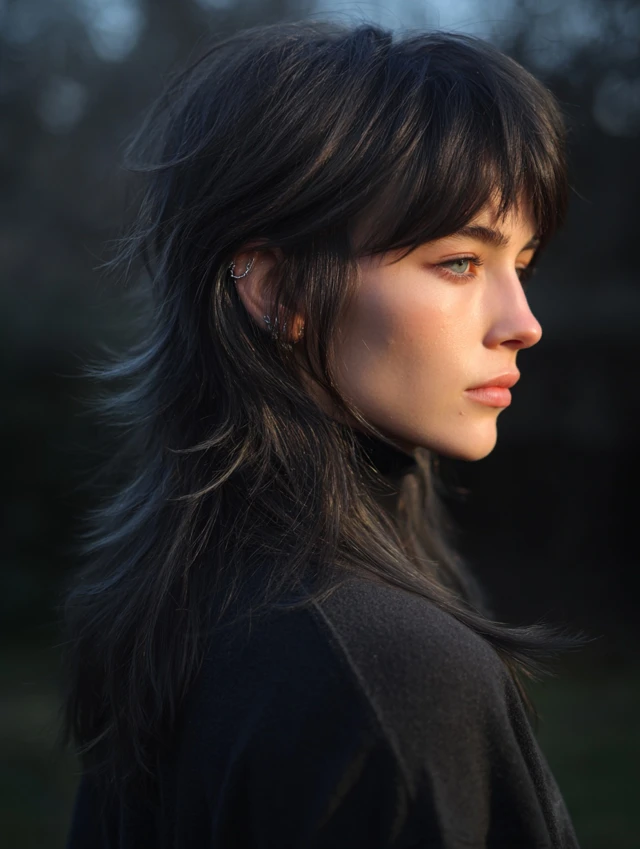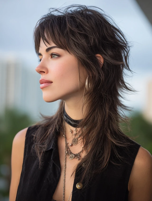 A long mullet wolf cut keeps length through the back while shaping shorter layers around the face. The contrast creates movement without feeling harsh. Soft texture at the ends keeps the silhouette fluid and wearable rather than costume-like.