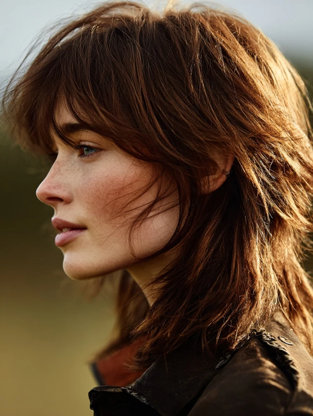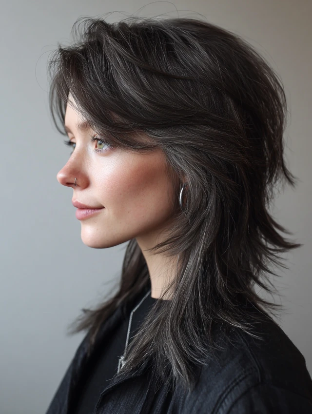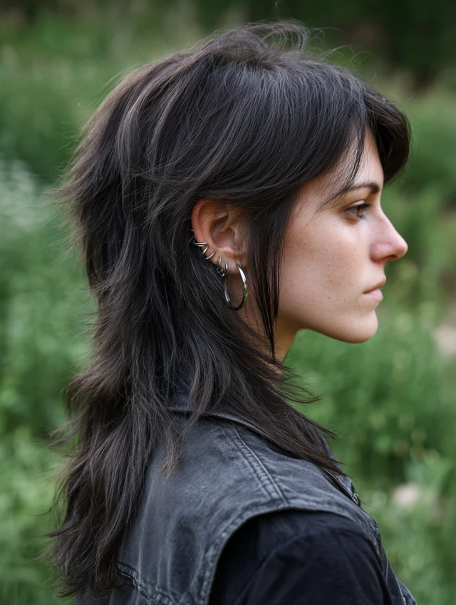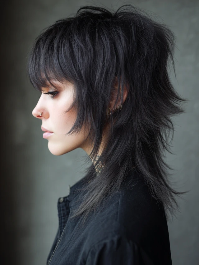 A choppy mullet wolf cut leans into uneven layers that heighten the rebellious feel. Piecey sections through the crown create lift and attitude, while textured ends keep the back light and flexible. The look feels bold but balanced.