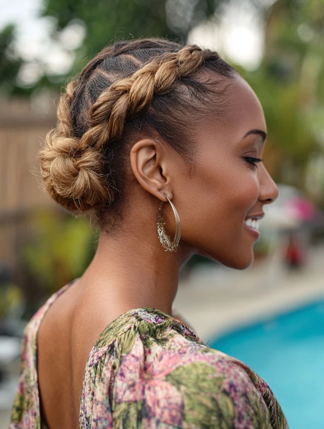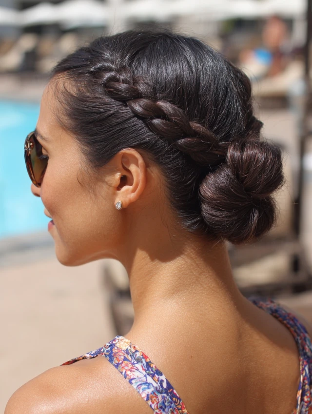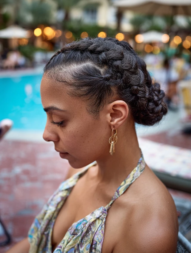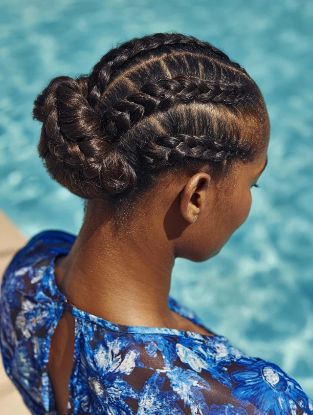 This version suits medium to long hair and most textures. Styling stays quick with two elastics and a few pins. It fits pool parties, resort days, and anyone wanting something fun that still protects ends.