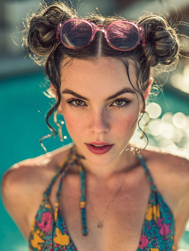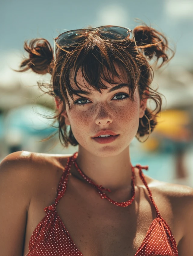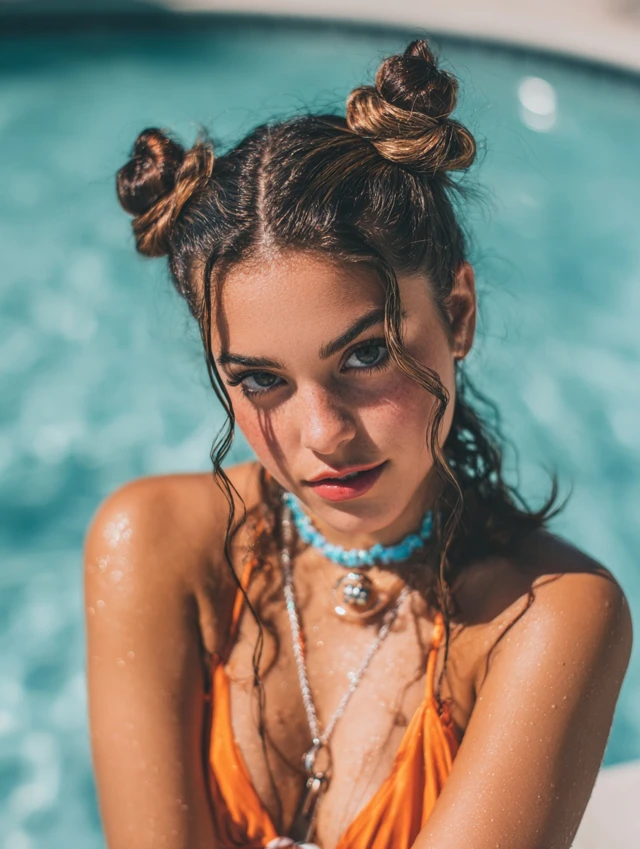 Space buns split hair into two small knots on either side of the head, keeping everything lifted and secure. The compact shape reduces tangling in the water and feels lighter than one heavy bun. Loose baby hairs around the hairline soften the look.