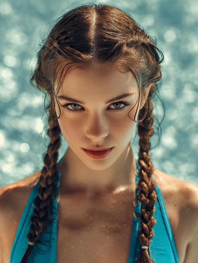 Twisted pigtails divide hair into two sections and roll each side backward before securing near the shoulders. The twists hold shorter layers better than braids and prevent hair from floating loose in the water.