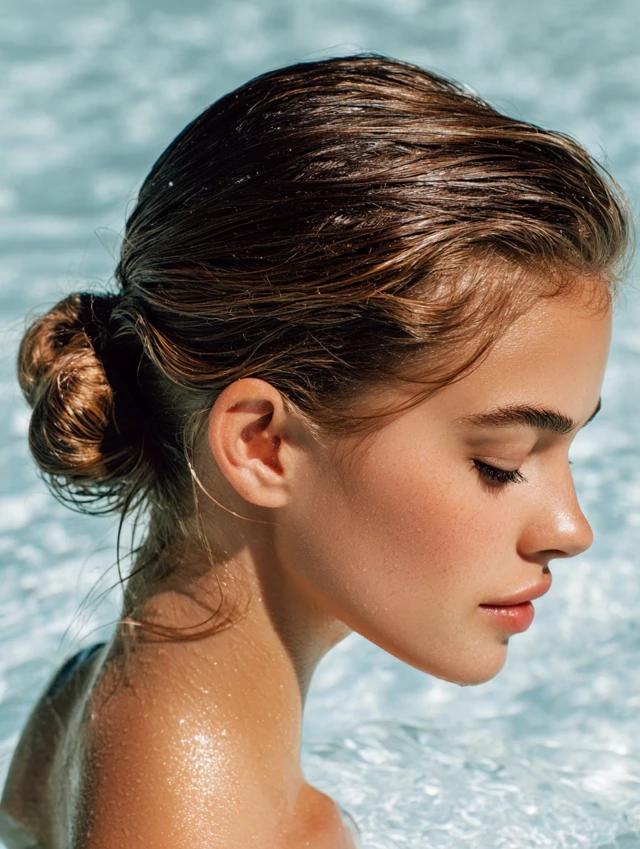 A slick low bun gathers hair tightly at the nape and keeps ends sealed inside. The smooth surface reduces friction in the water and limits frizz once you dry off. The shape stays clean even after repeated dips.