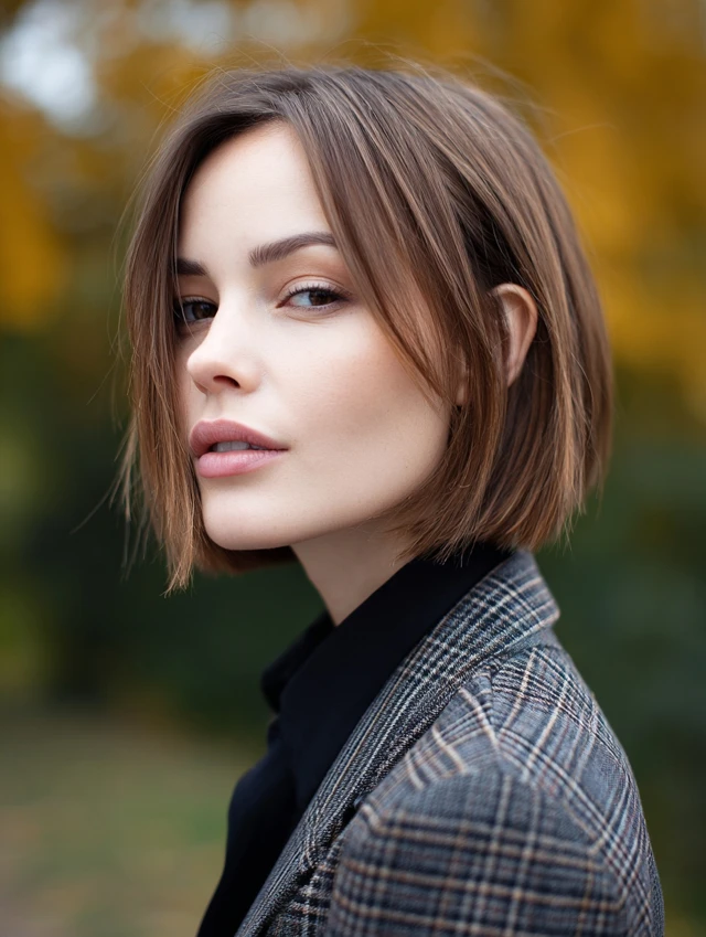 A chin-length razor cut bob keeps the outline clean while softening the tips into feathered pieces. The texture prevents heaviness near the jaw and highlights cheekbones gently. Light interior slicing adds lift through the crown without creating frizz.