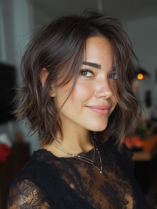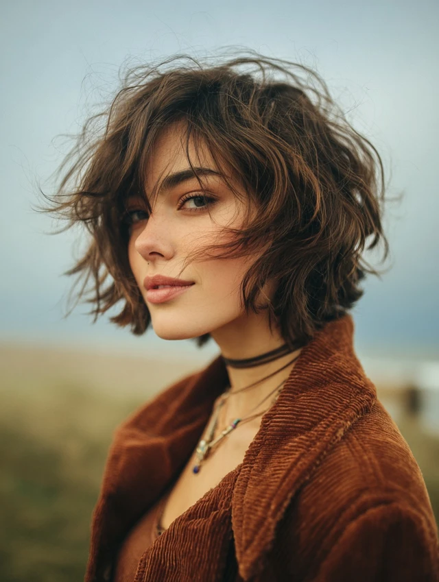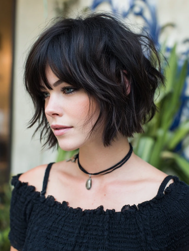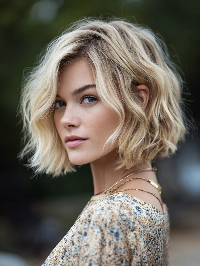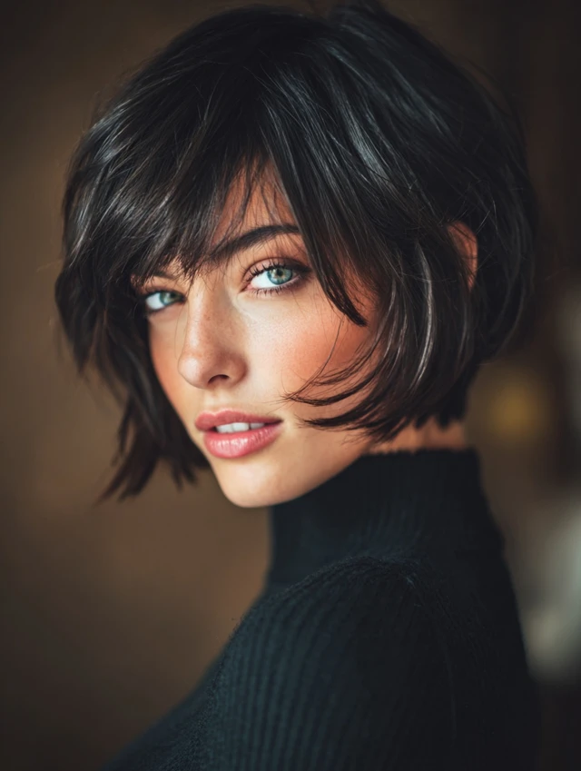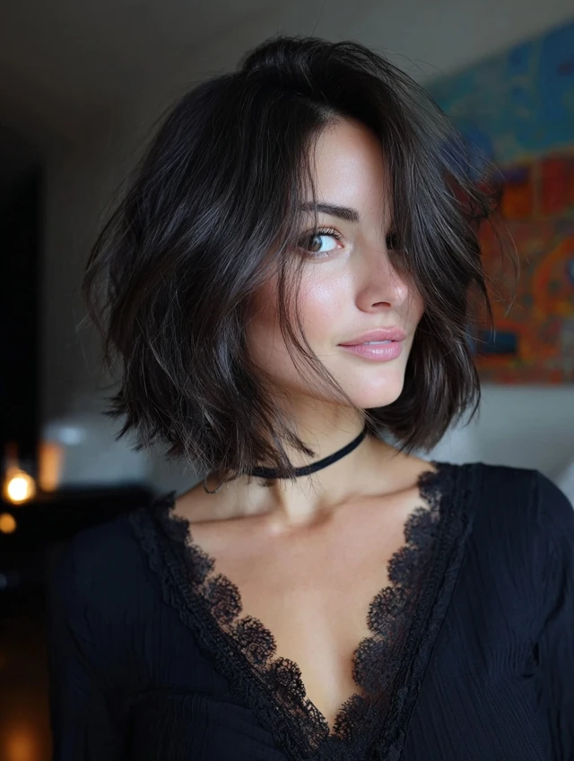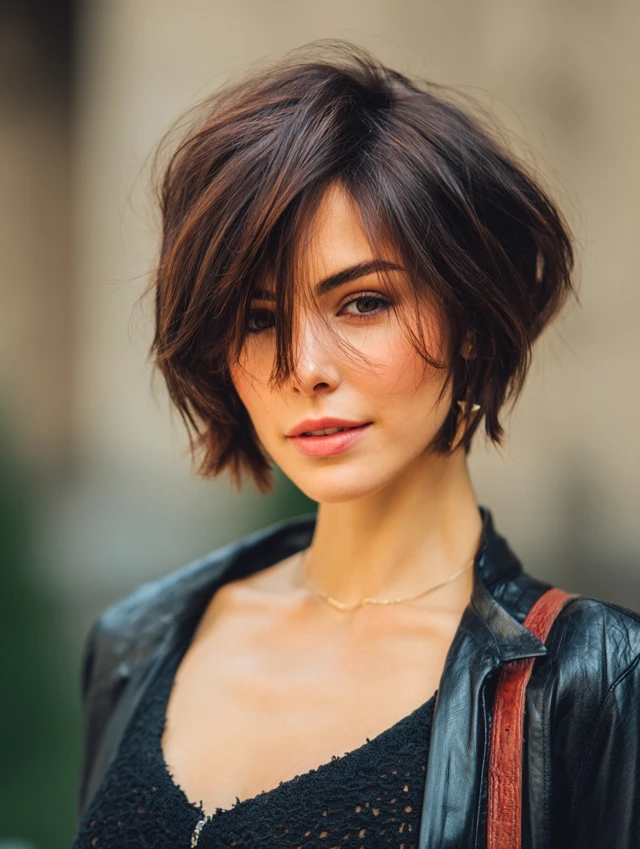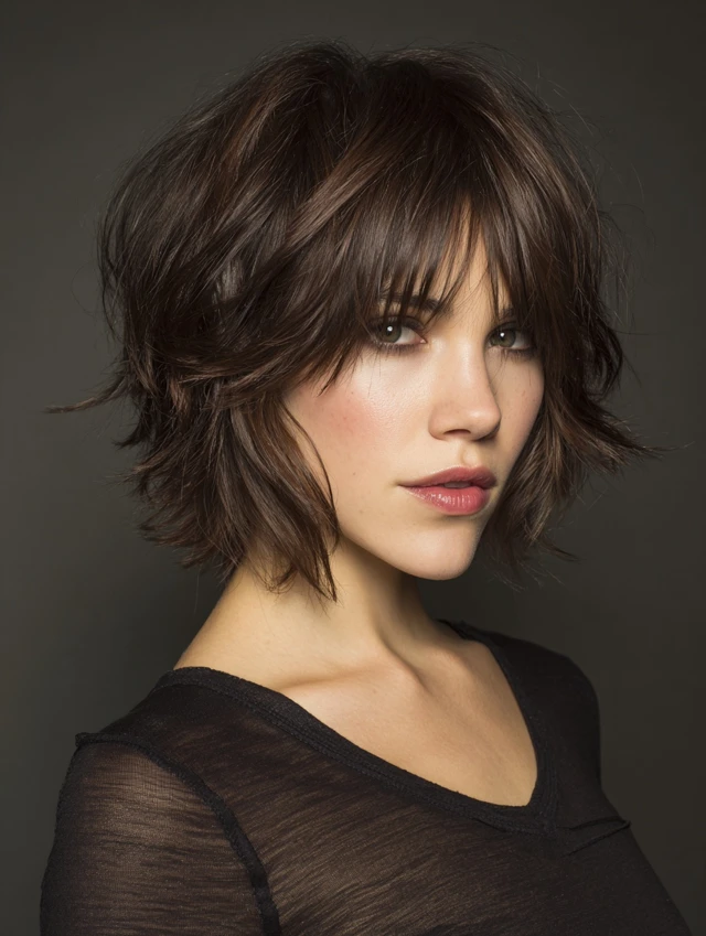 A short razor cut bob uses sliced layers around the crown and sides to build lift without bulk. The ends stay light and broken, which keeps the silhouette playful instead of sharp. This shape highlights cheekbones and opens the face while staying easy to manage.